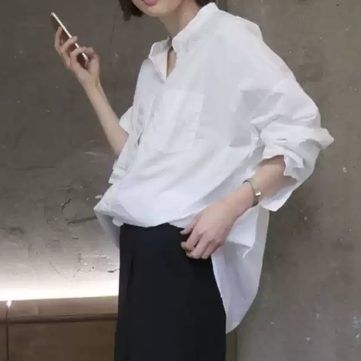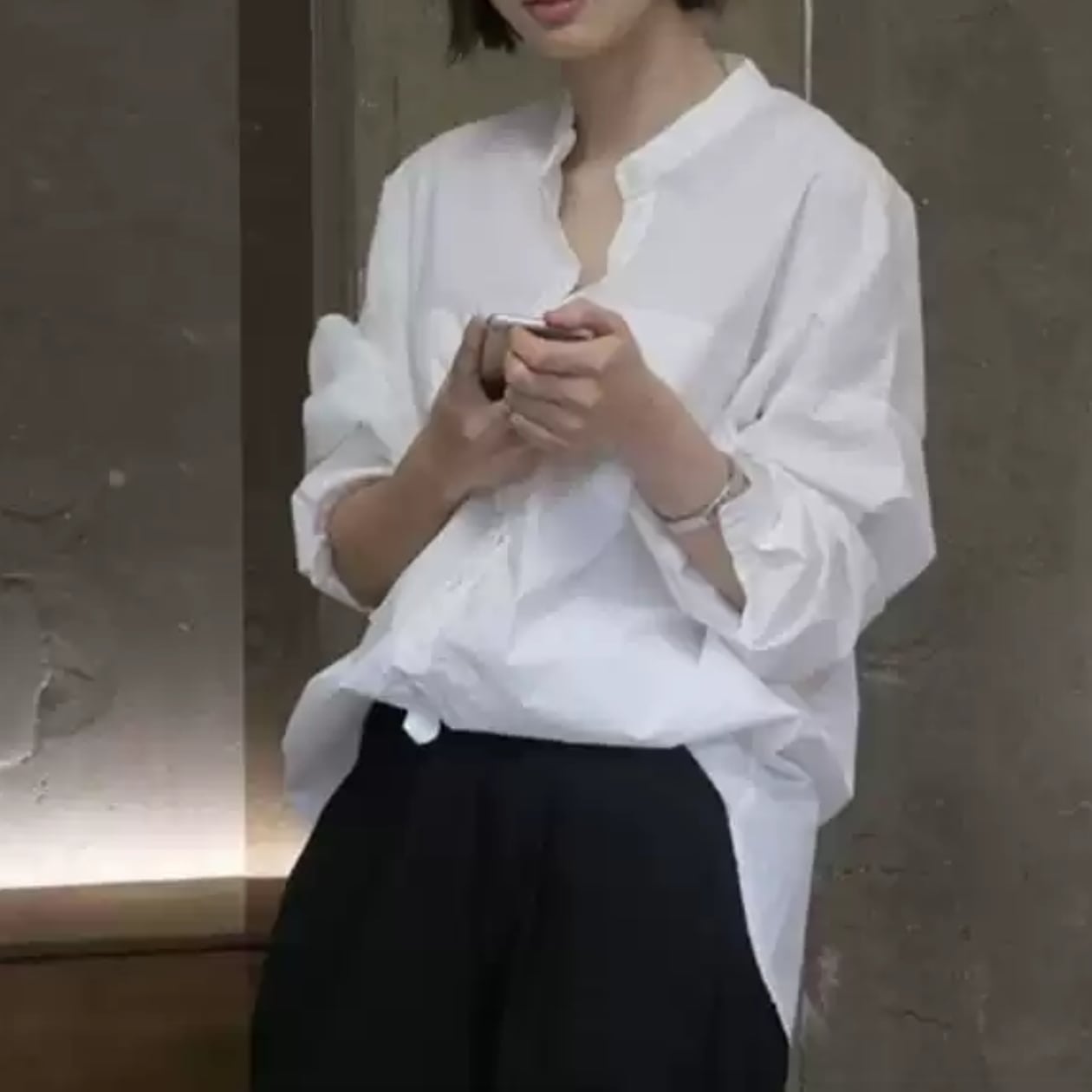 スタンドカラーボタンフロントロングスリーブオーバーサイズシャツは、一枚で着てもサマになる存在感と、着回し力の高さが魅力です!