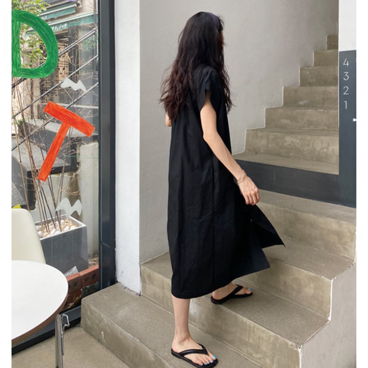 ストレートシルエットで体型をカバーしつつ、上品な印象を演出。