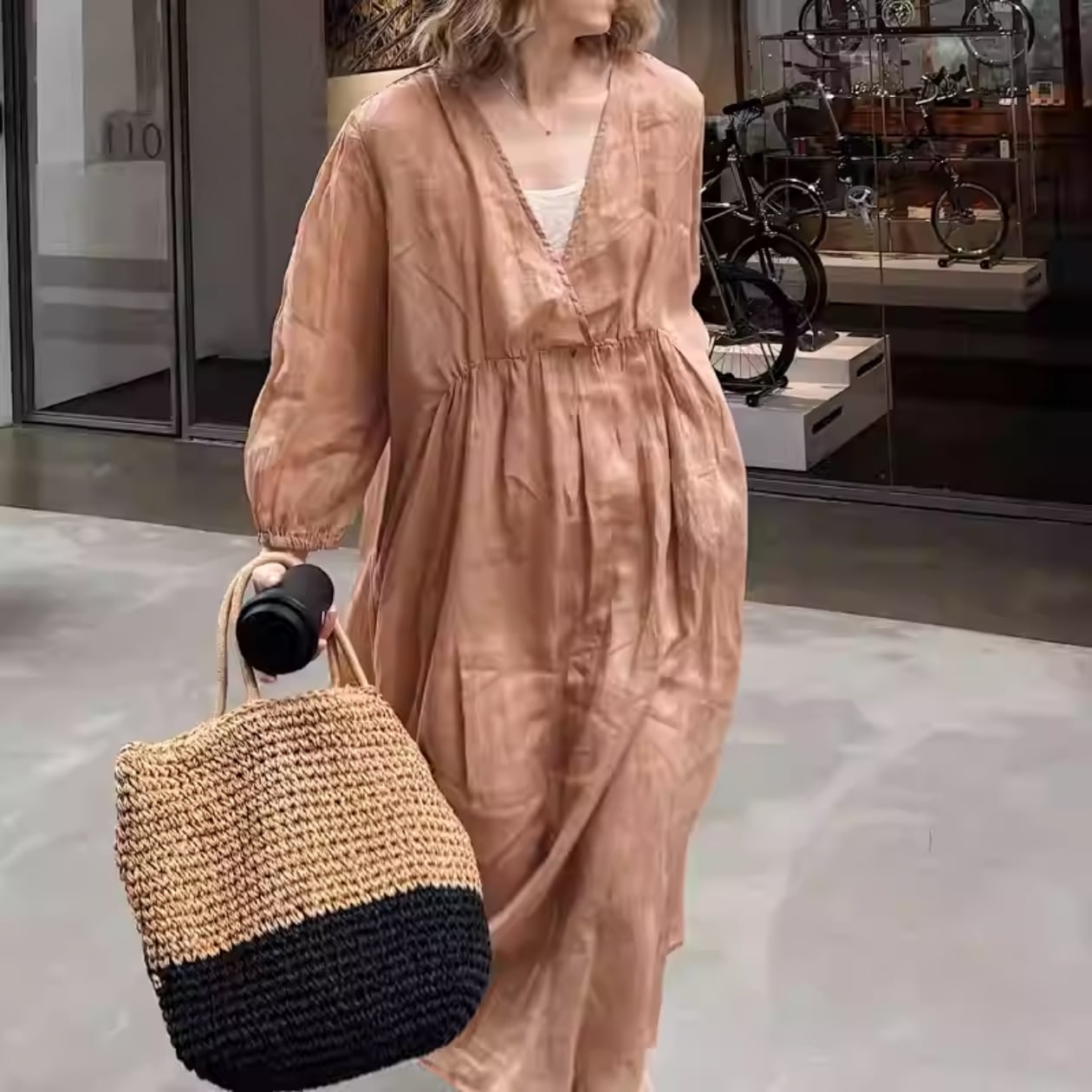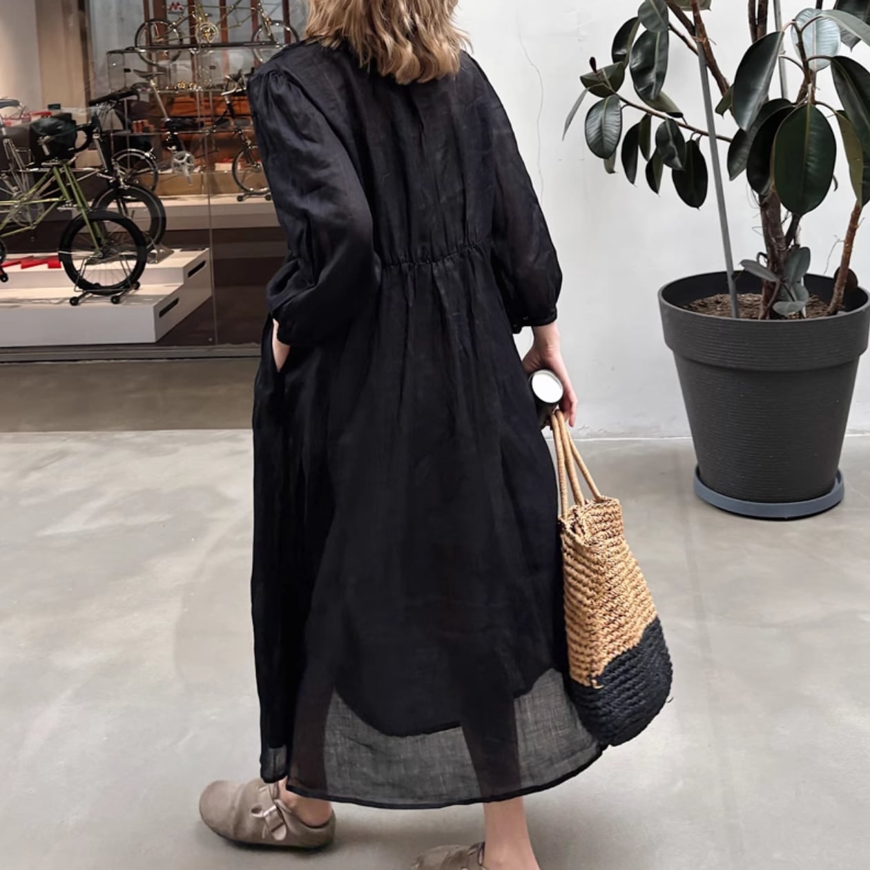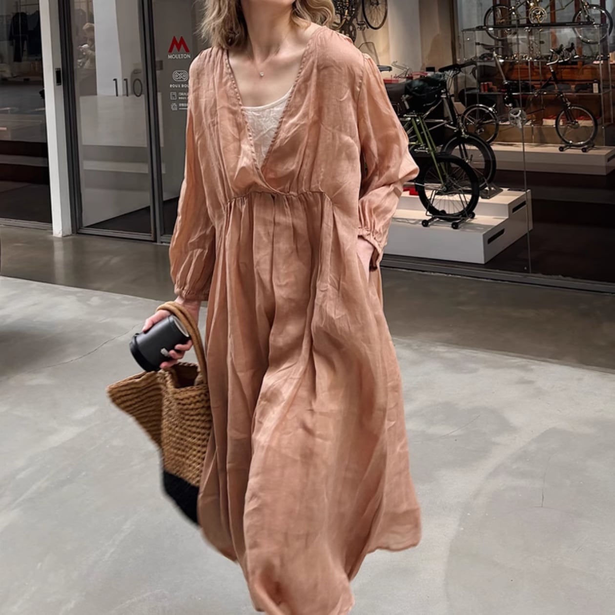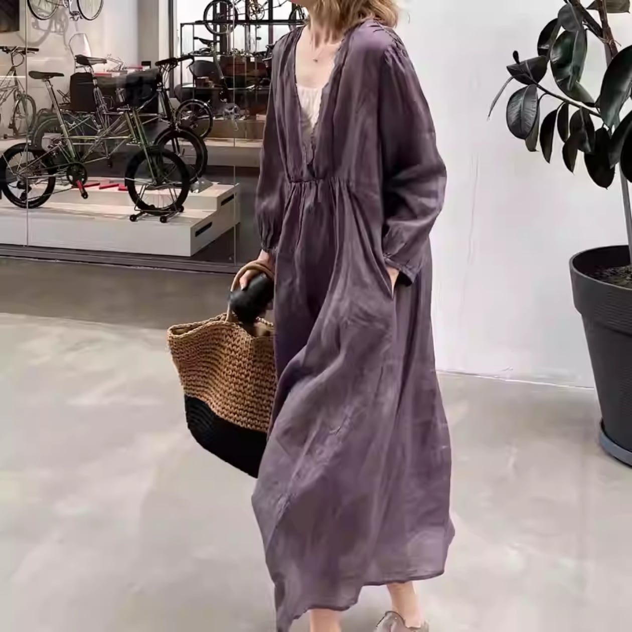 Aラインシルエットが美しいロングワンピースは、着るだけで女性らしい雰囲気を演出します。