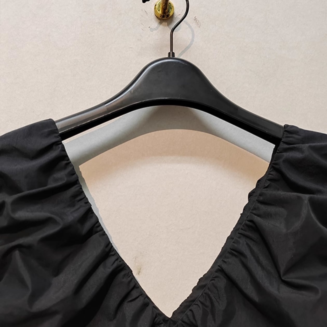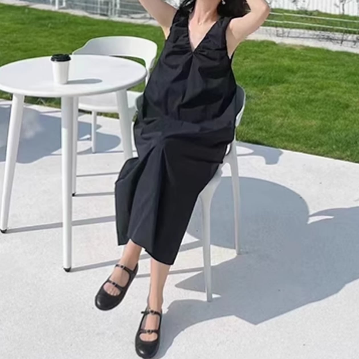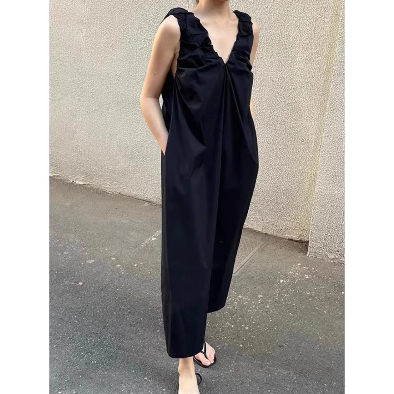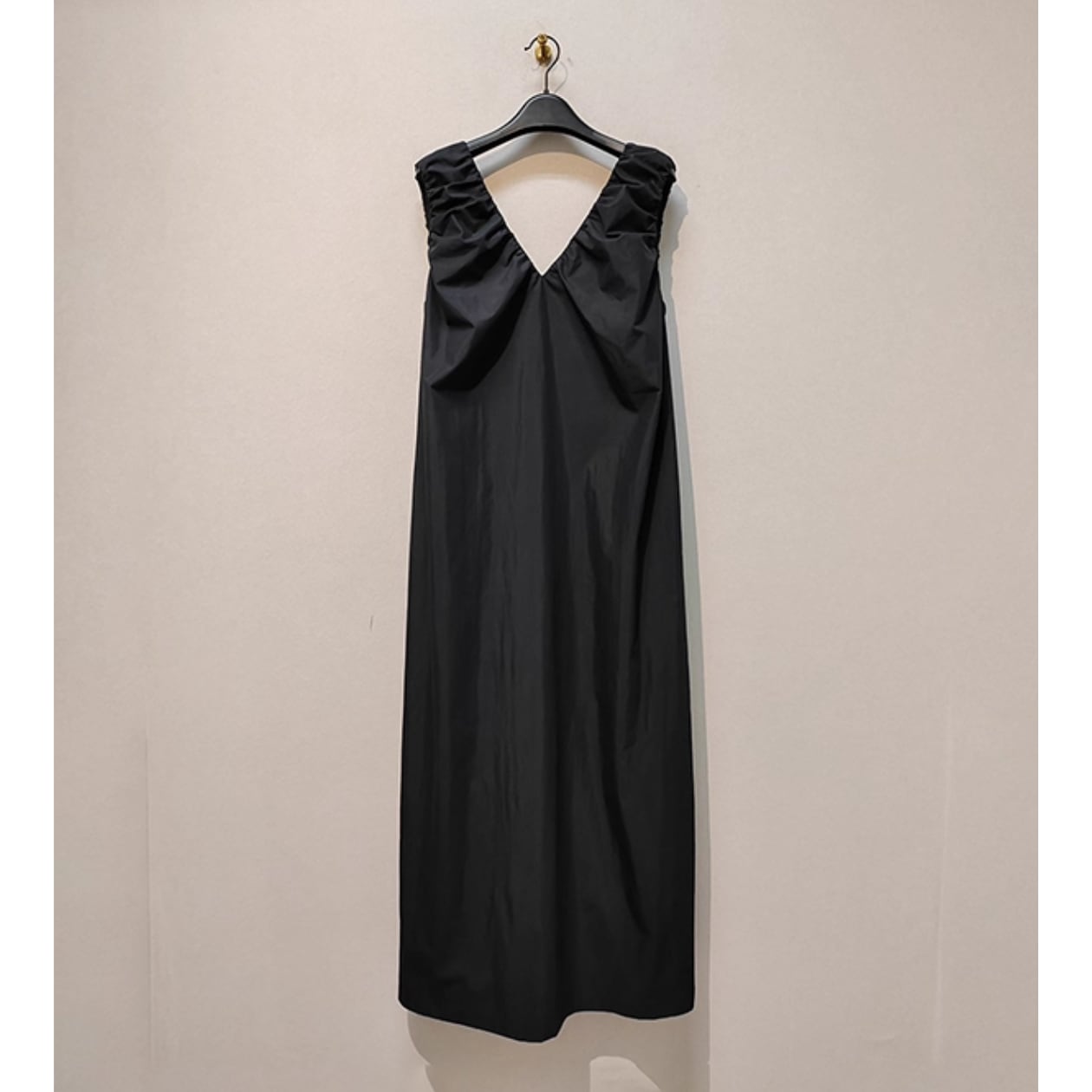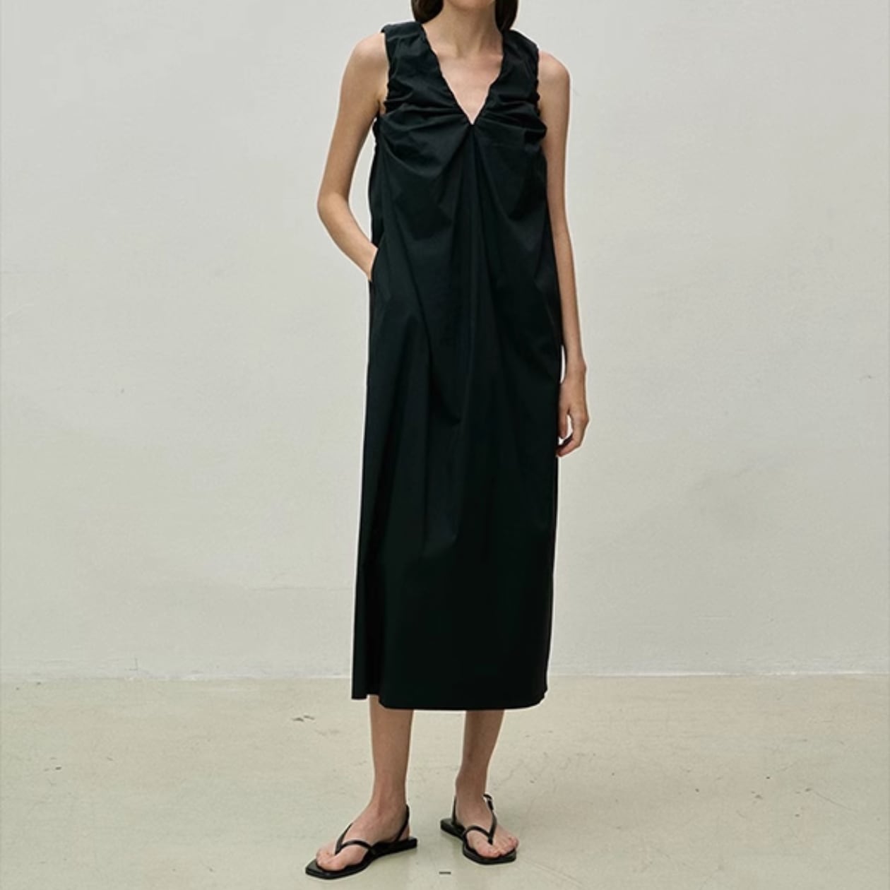 Vネックとギャザーデザインが女性らしさを引き立て、ノースリーブで涼しげな着心地も魅力です。