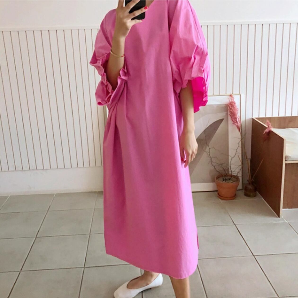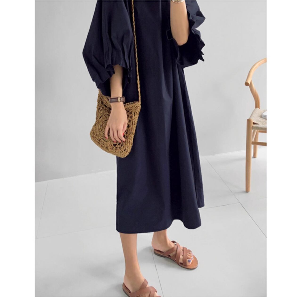 バルーンスリーブがポイントのワンピースは、一枚で着映えするミモレ丈が魅力です!