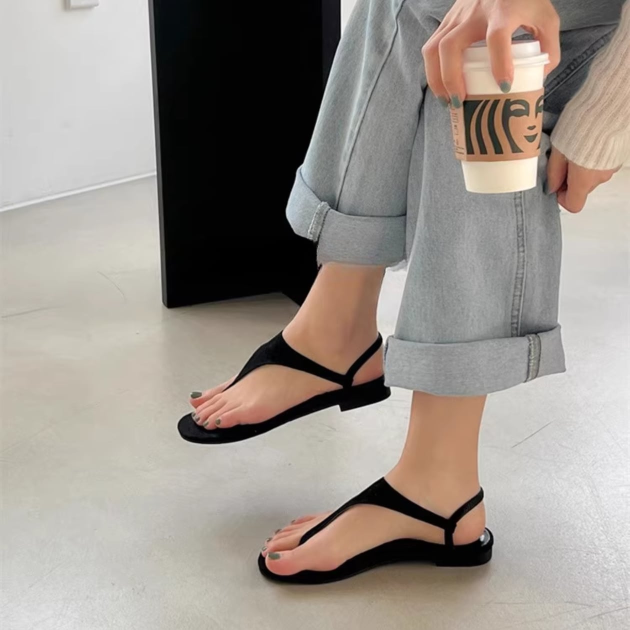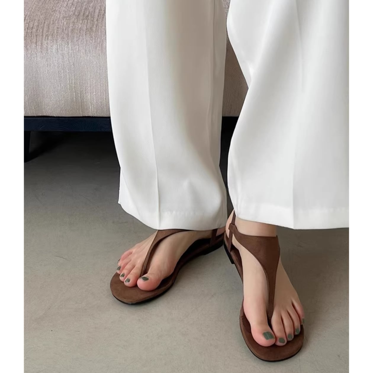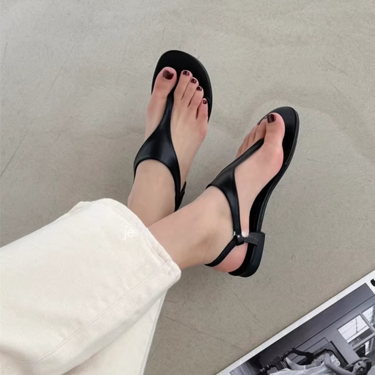 T字ストラップのフラットサンダルは、どんなスタイルにも合わせやすい万能アイテム☆