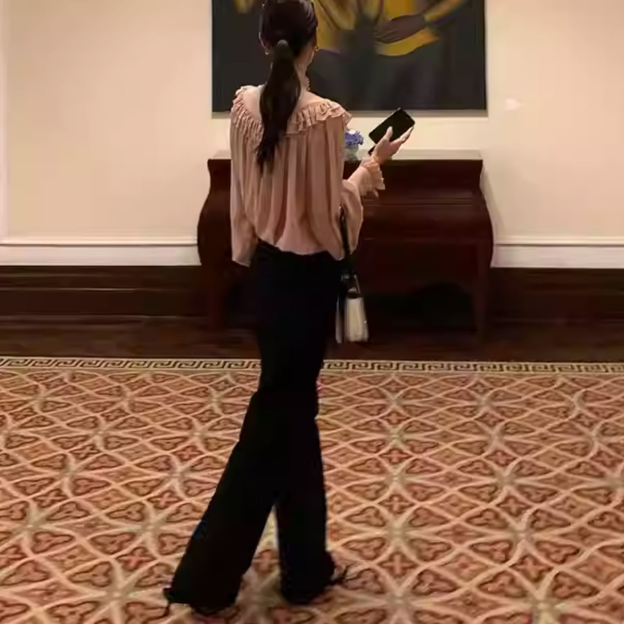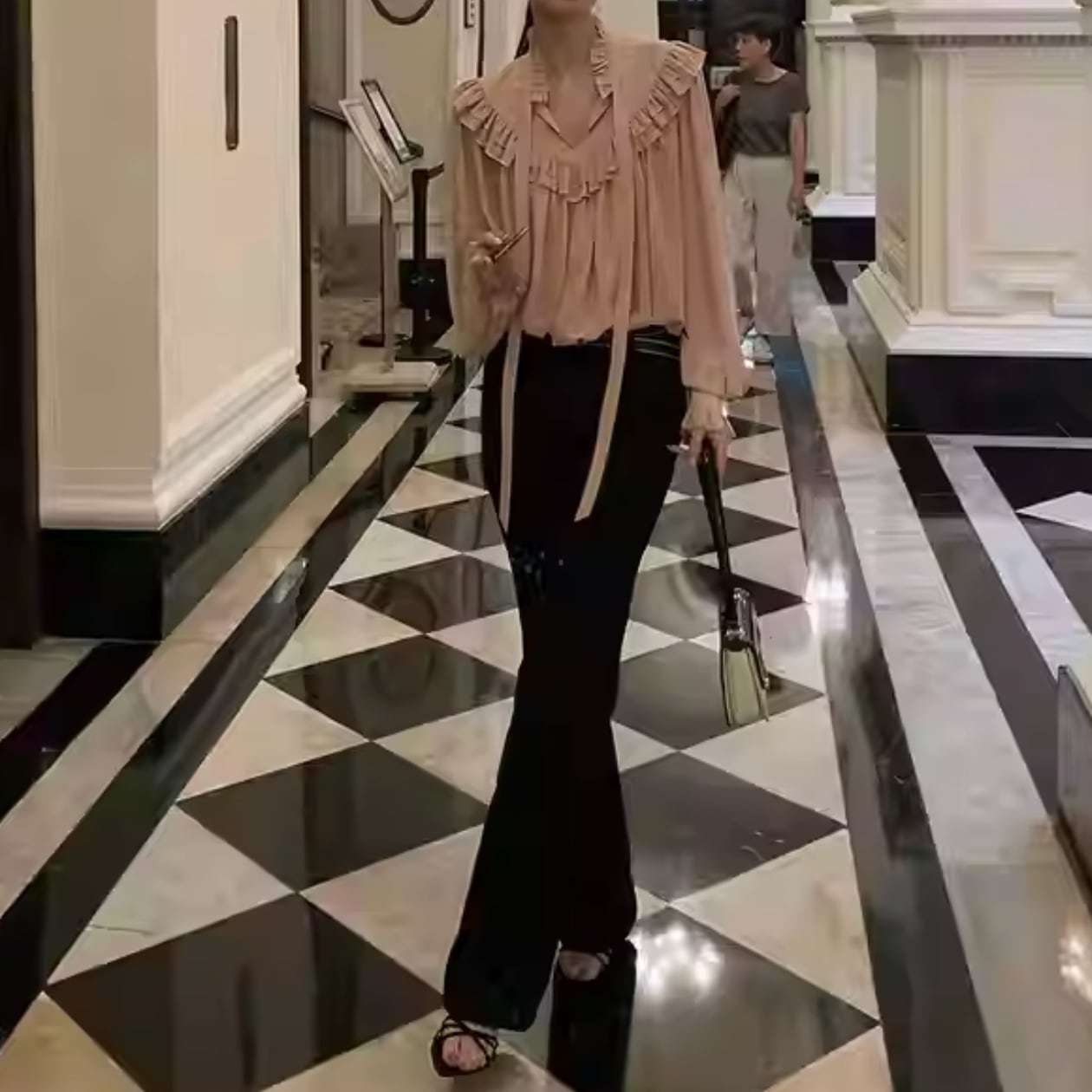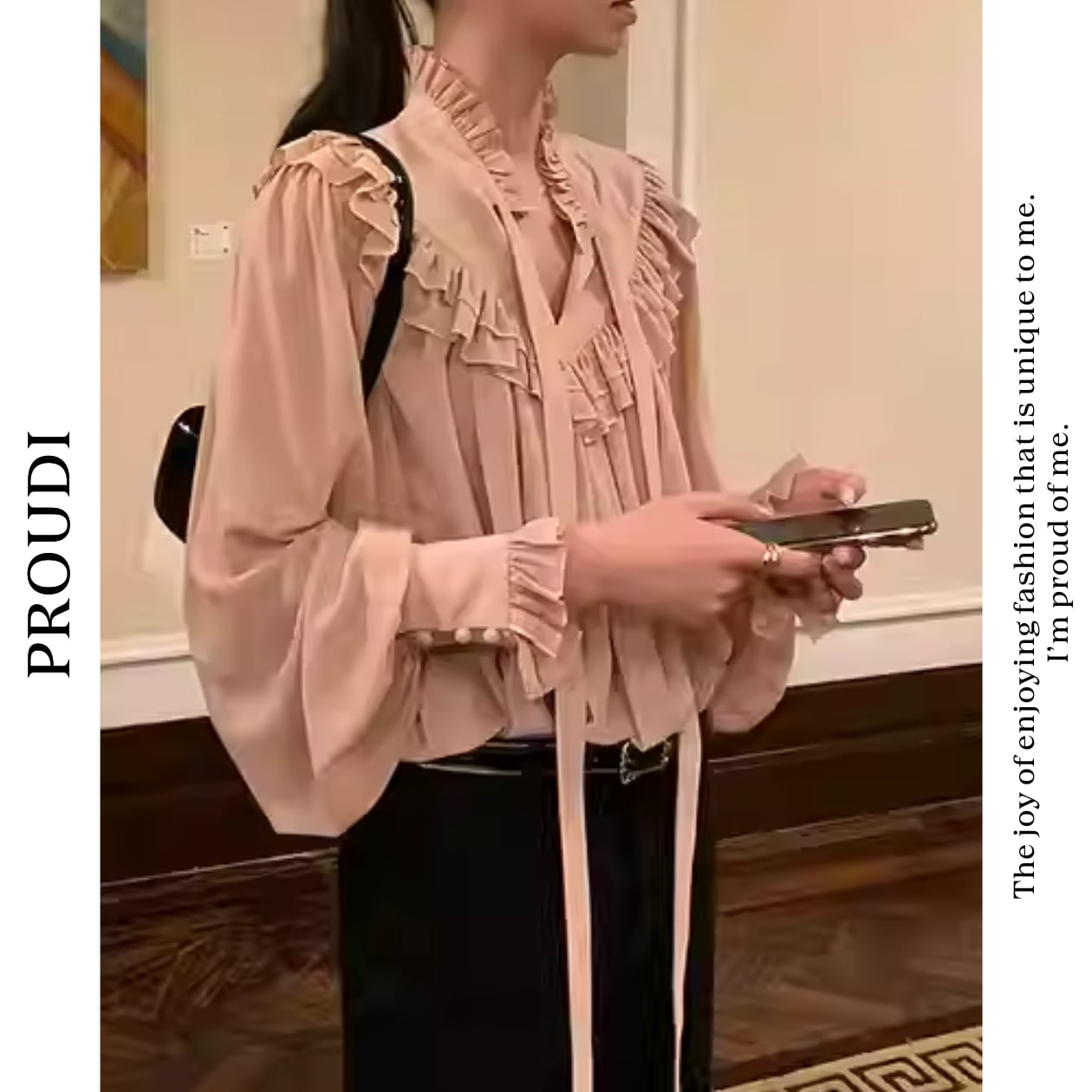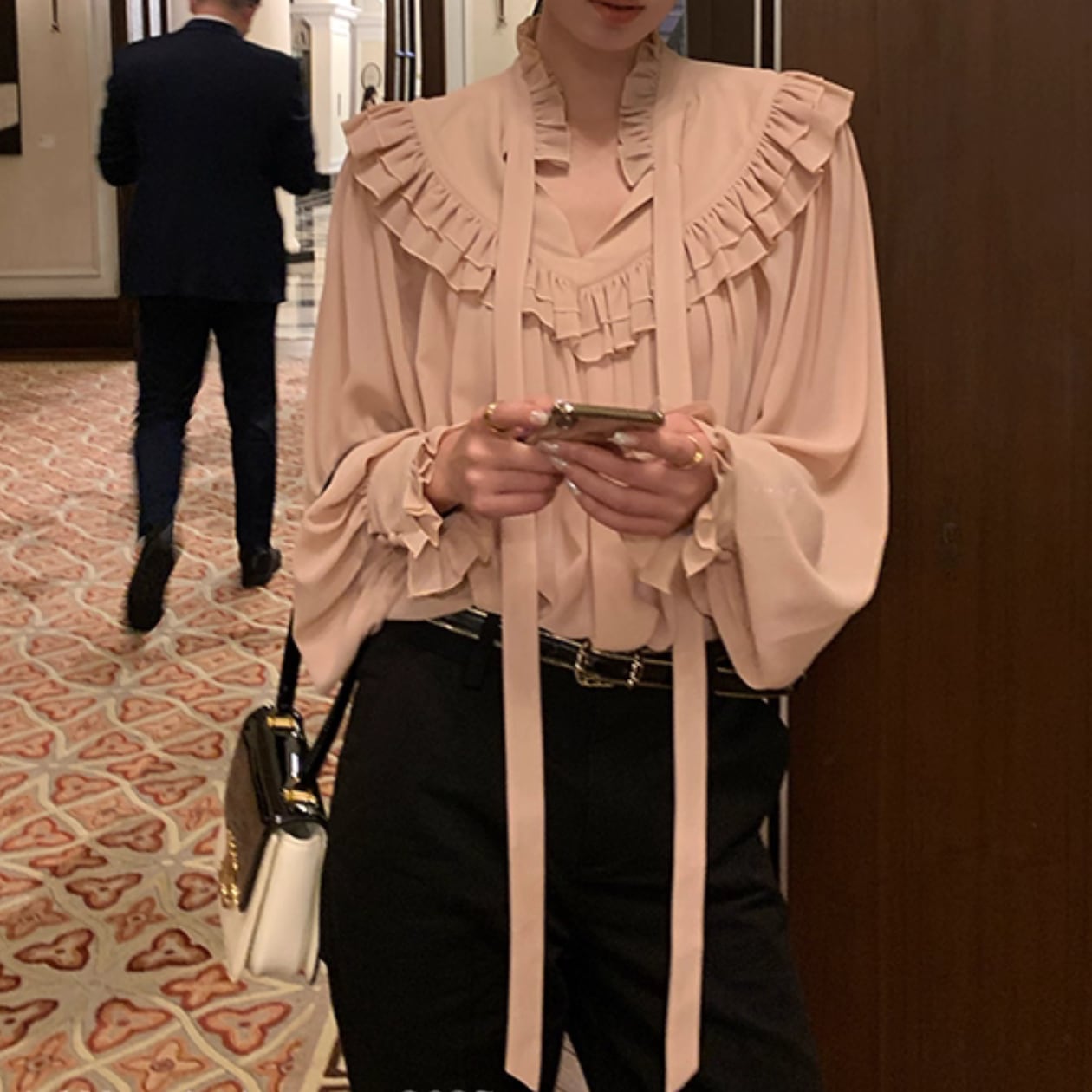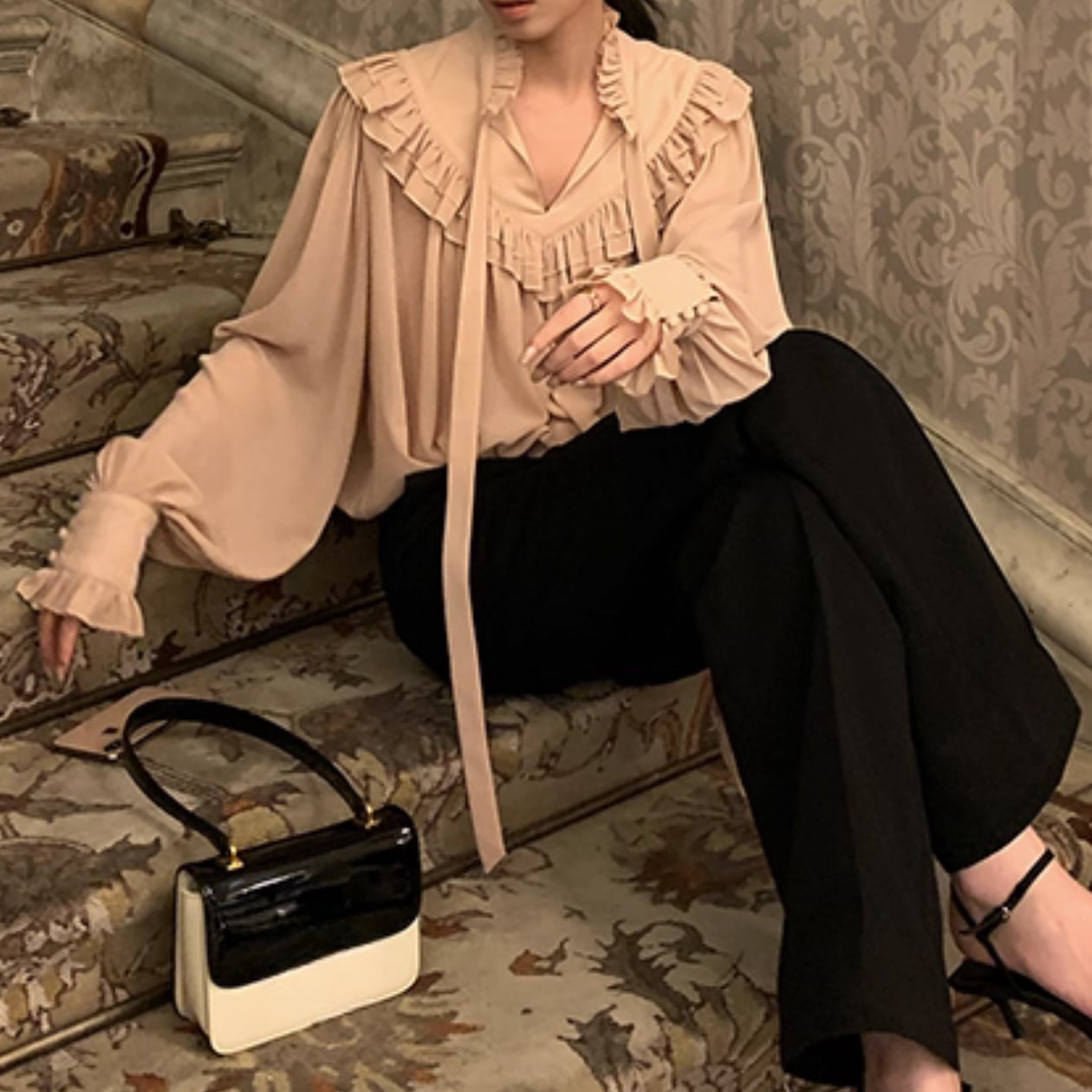 エレガントな雰囲気を纏えるスタンドカラーVネックボウタイシャツ。