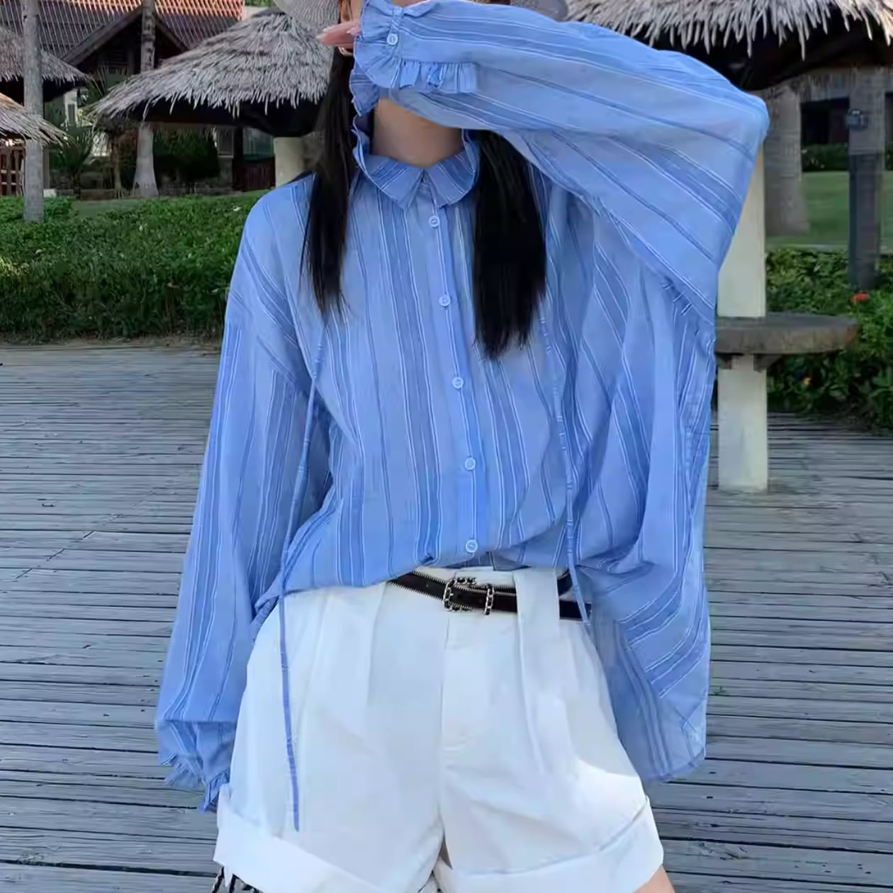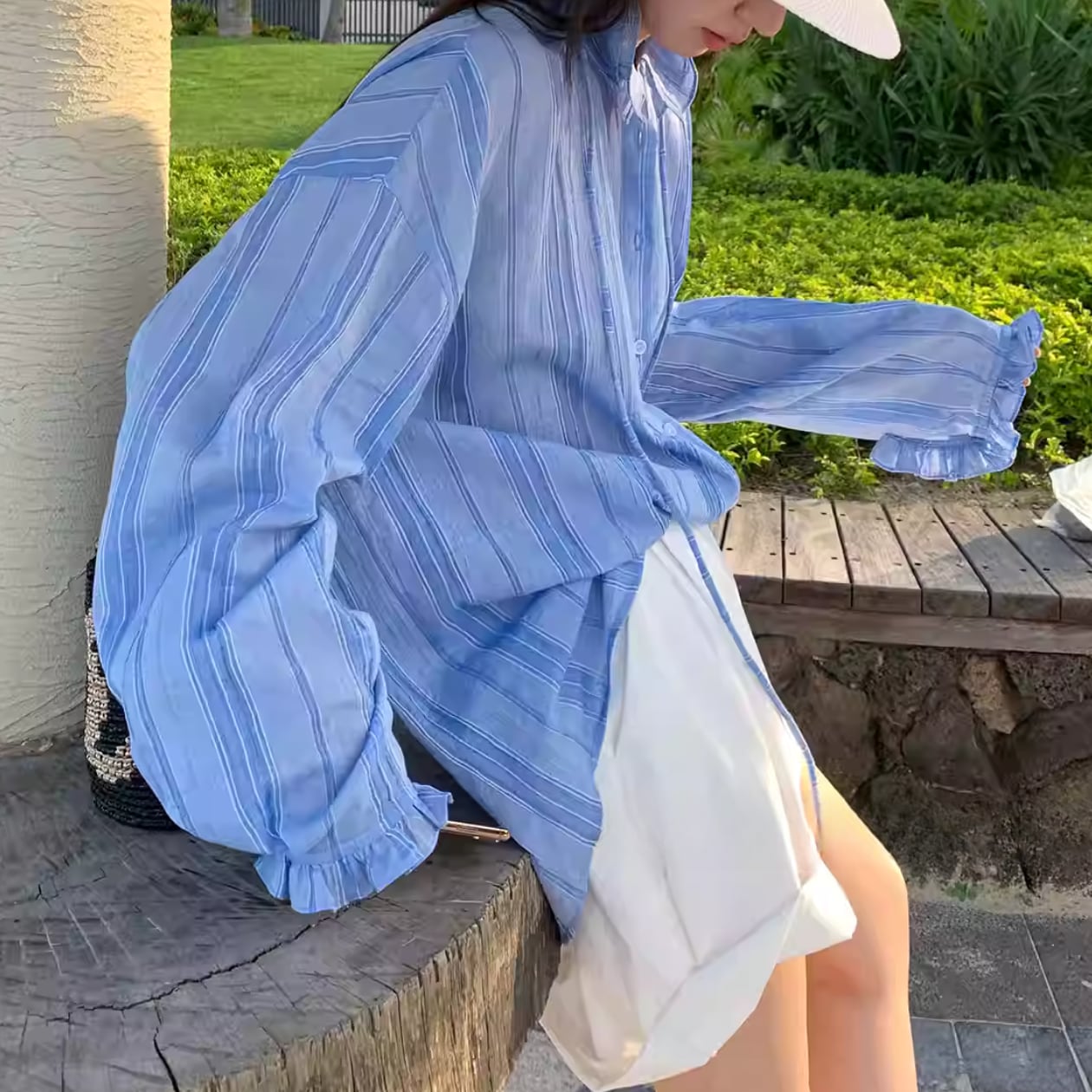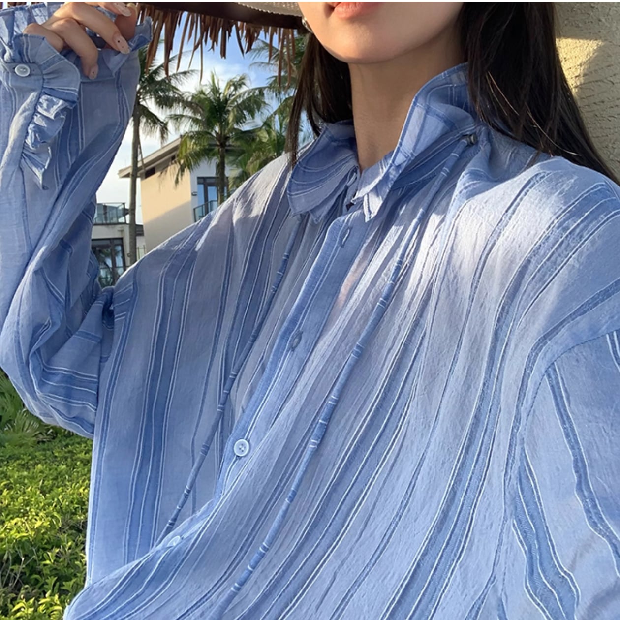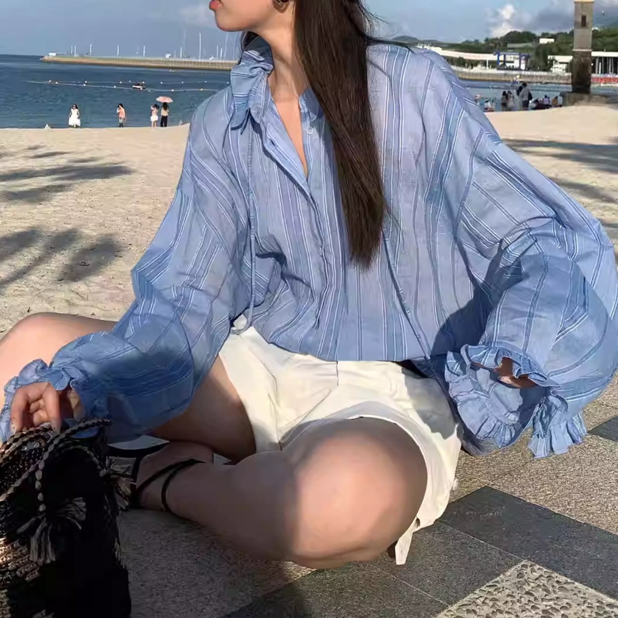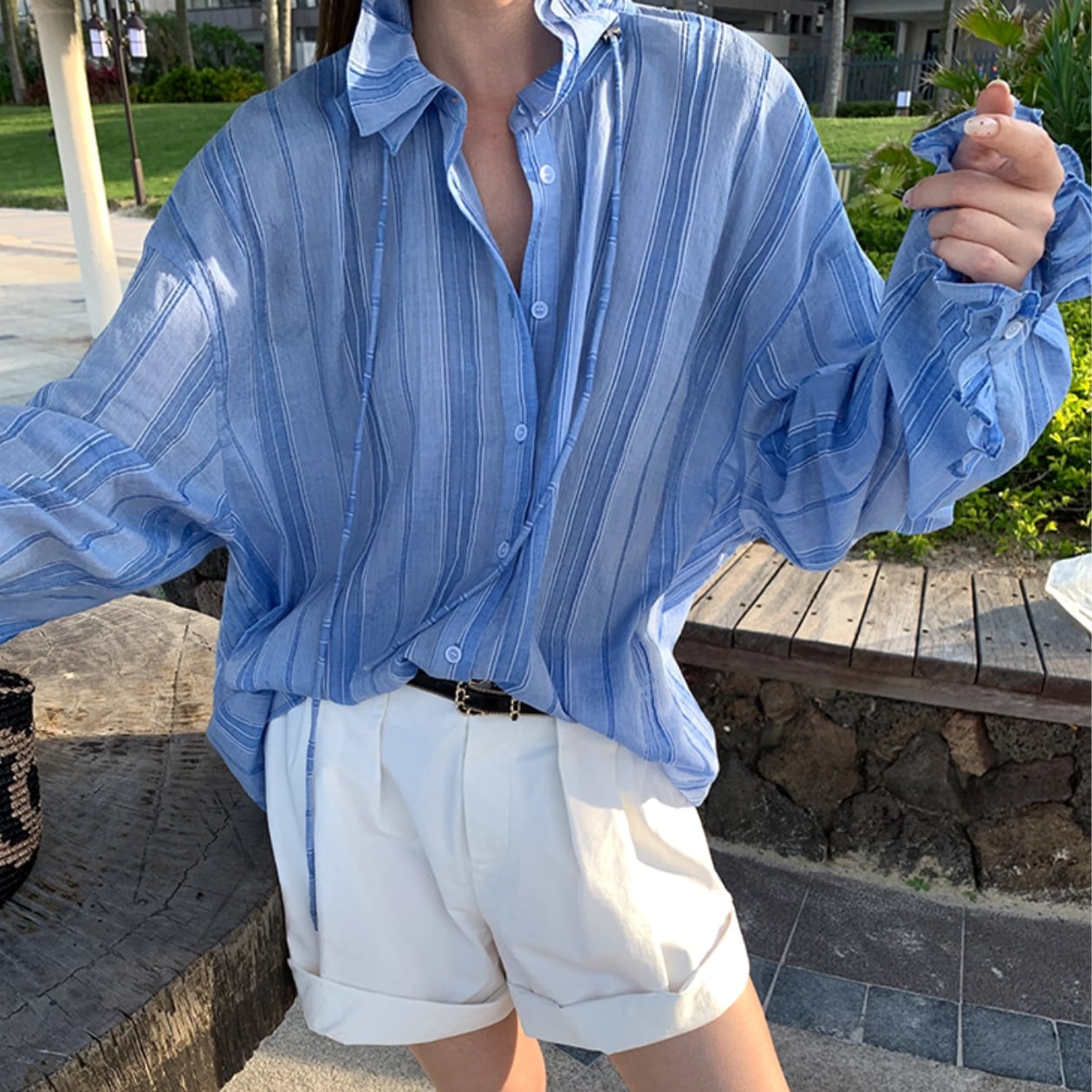 着心地抜群!ストライプ柄バンドカラーバルーンスリーブシャツで、夏のオシャレを楽しみましょう♪