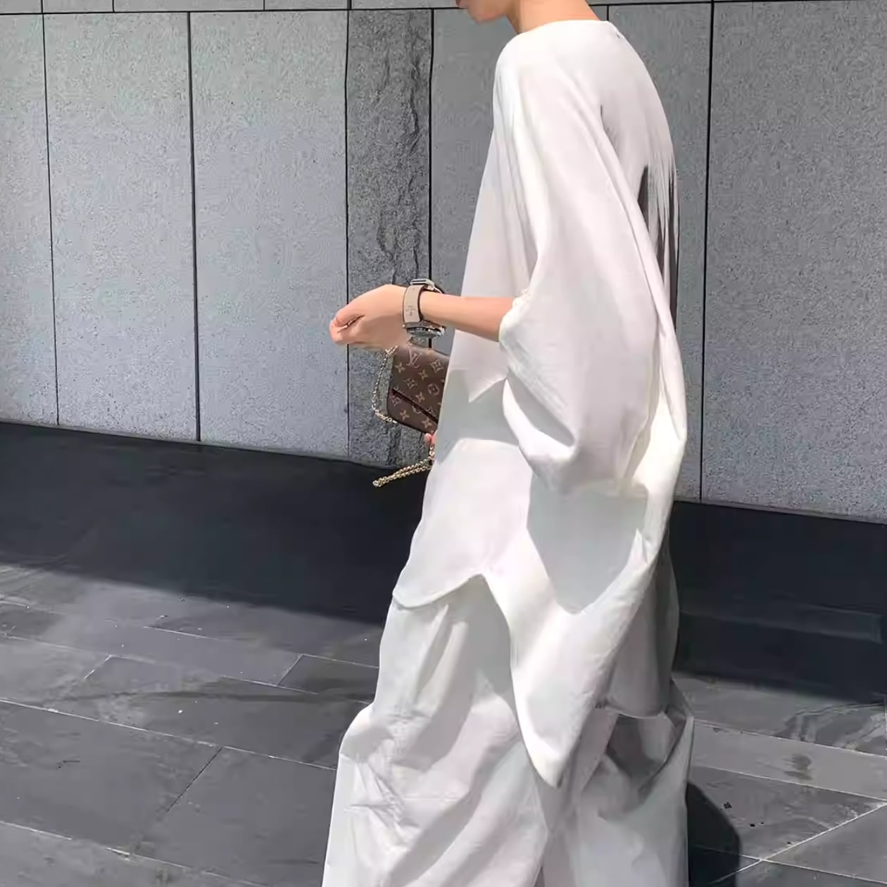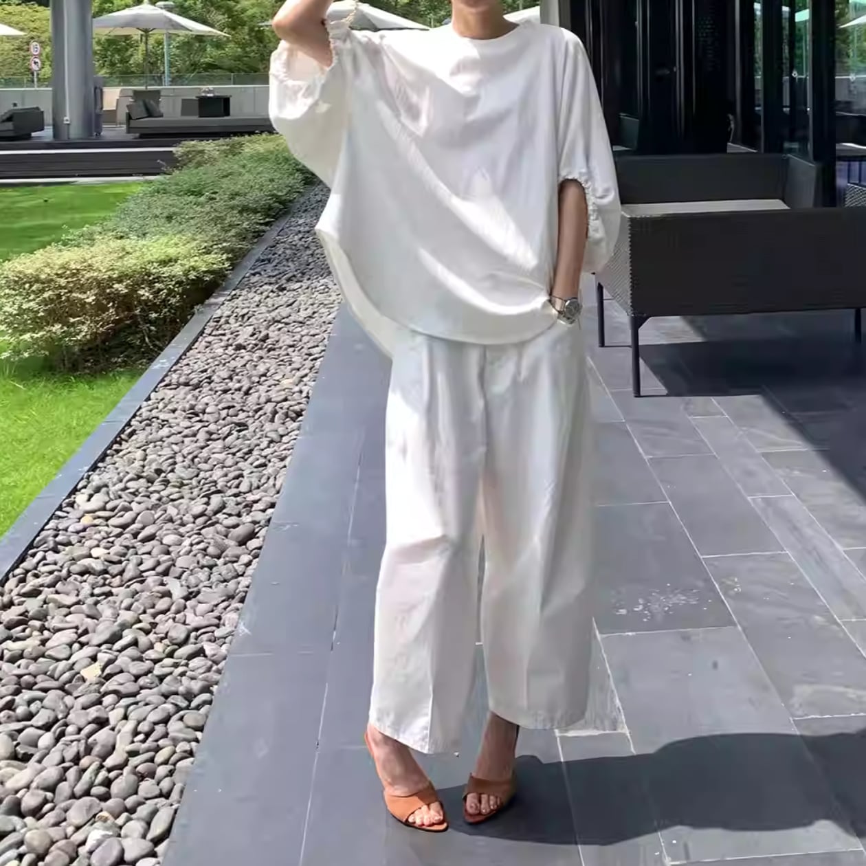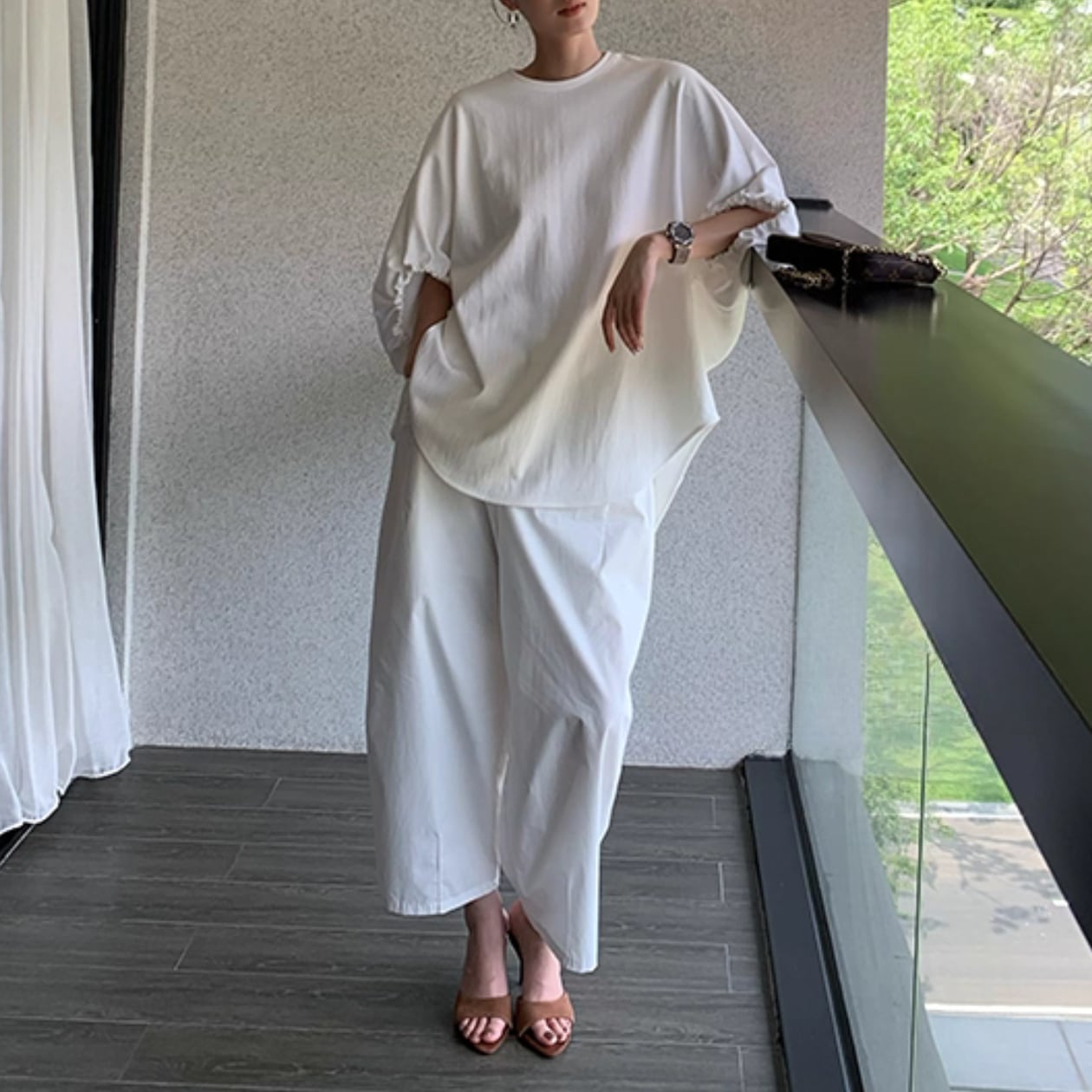 バルーンスリーブとドロップショルダーが絶妙なバランスを生み出すトップス。
