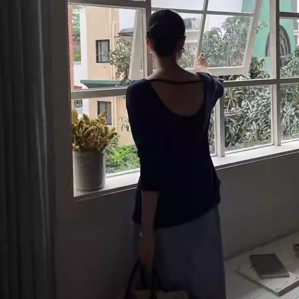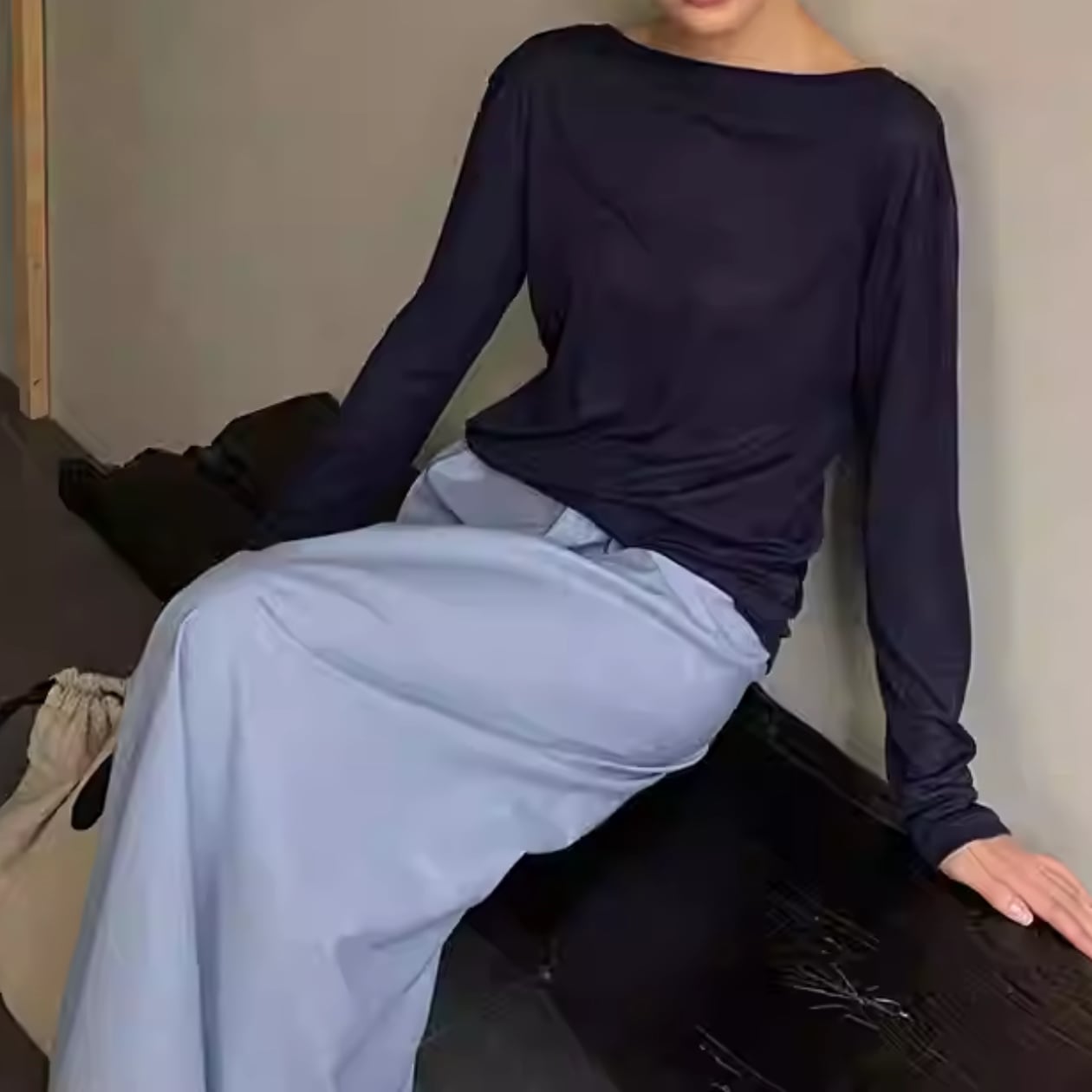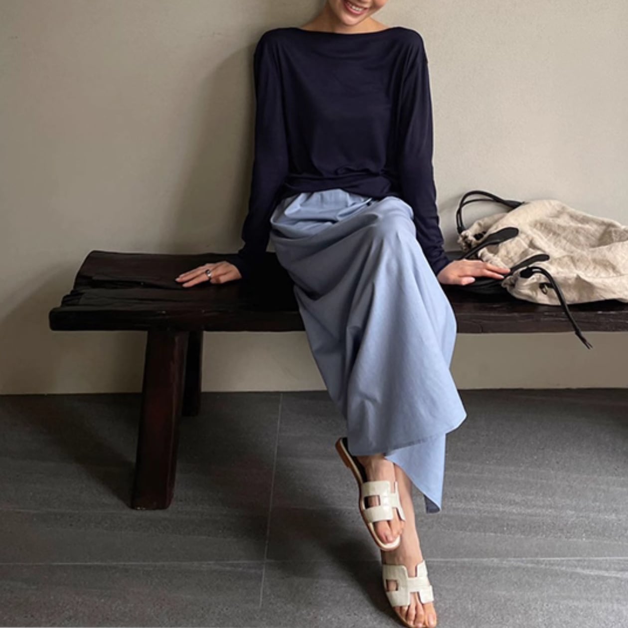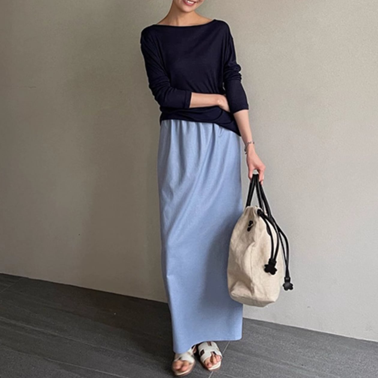 ボートネックとドルマンスリーブが、大人の女性らしいリラックス感を演出する長袖トップス。