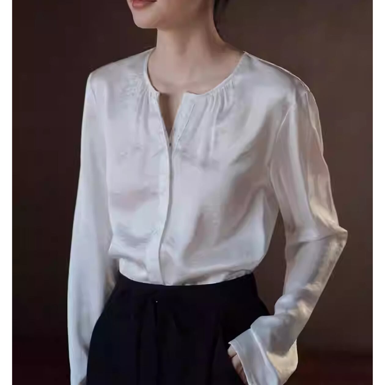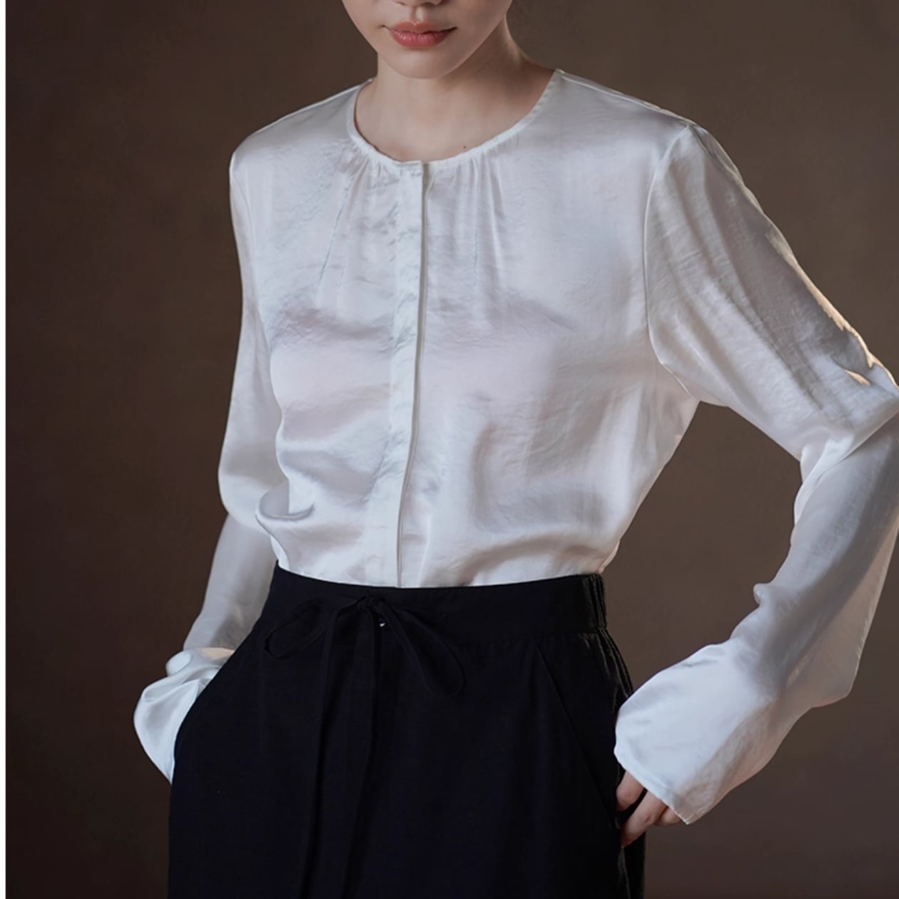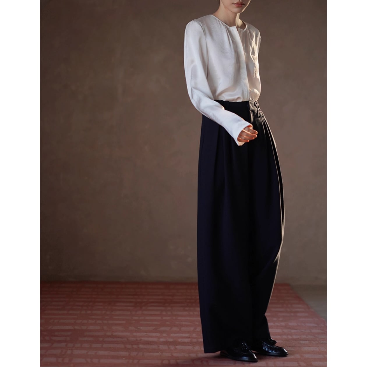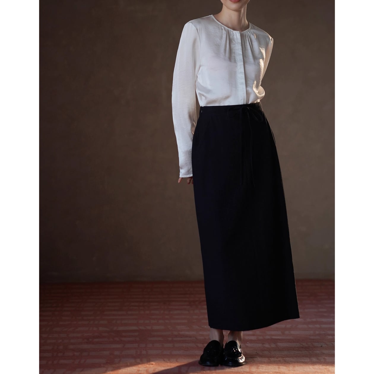 ギャザーネックがポイントのブラウスは、オフィススタイルにもカジュアルにも着こなせる万能アイテム。