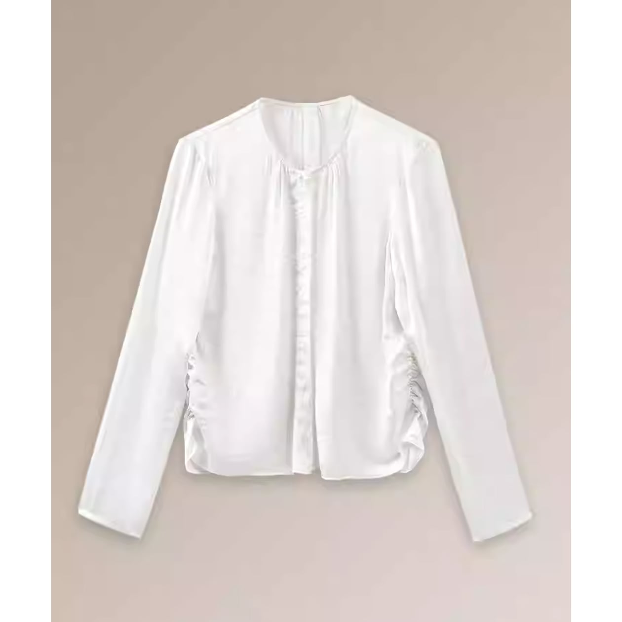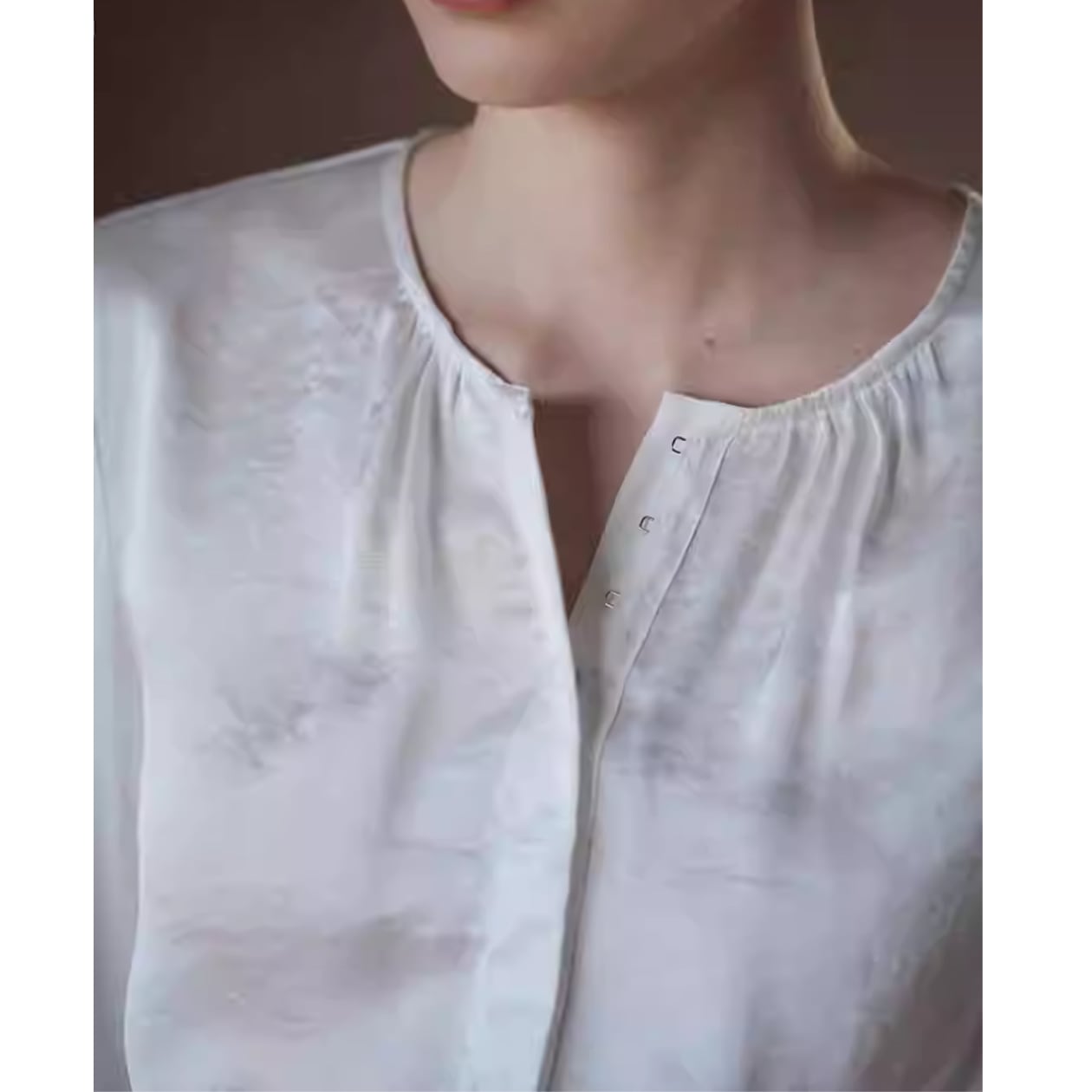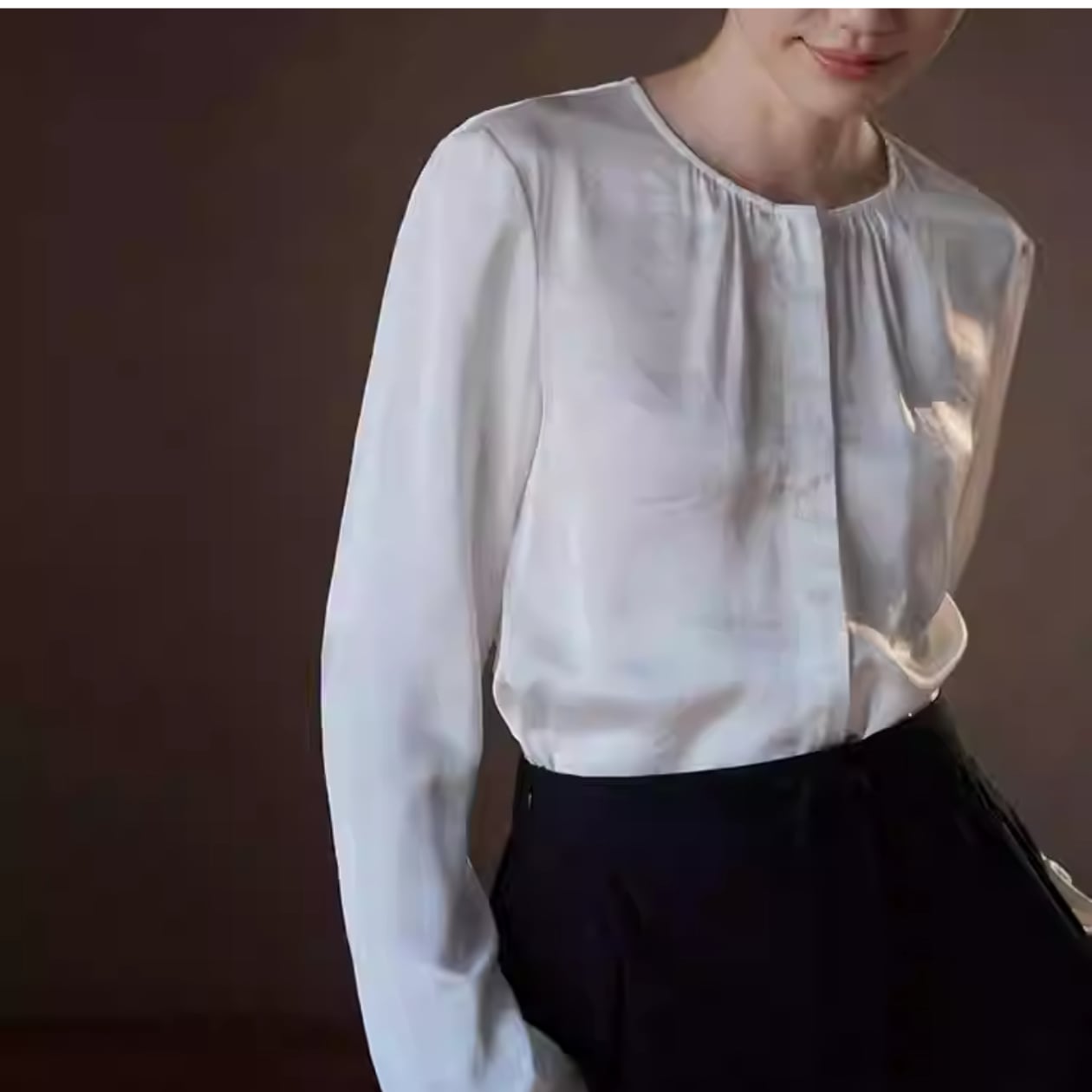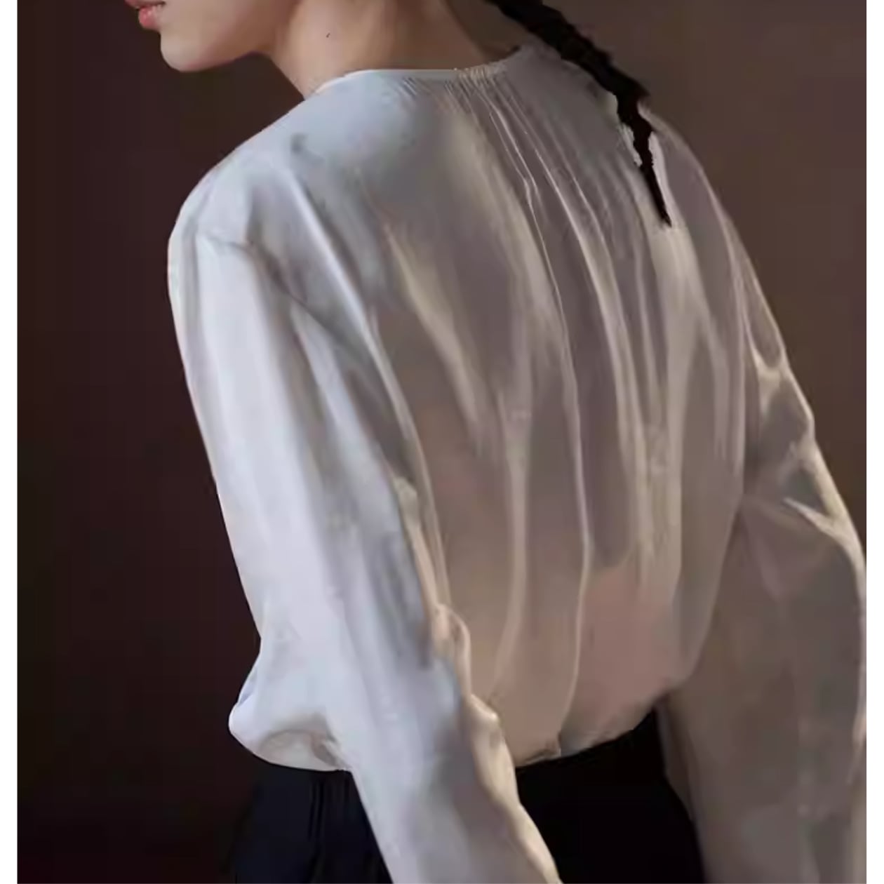 ギャザーネックがポイントのブラウスは、オフィススタイルにもカジュアルにも着こなせる万能アイテム。