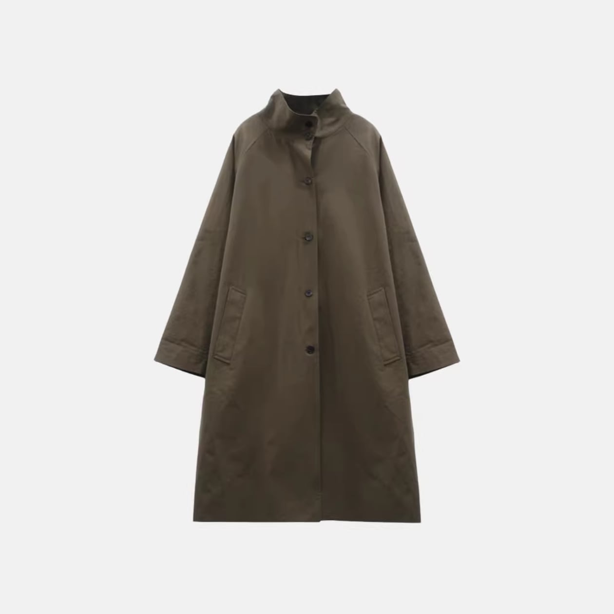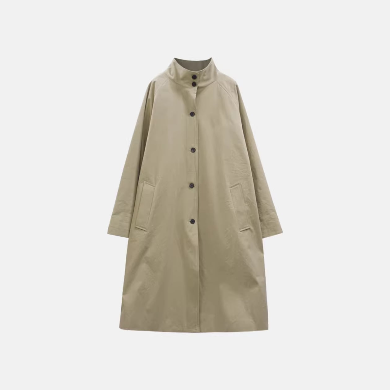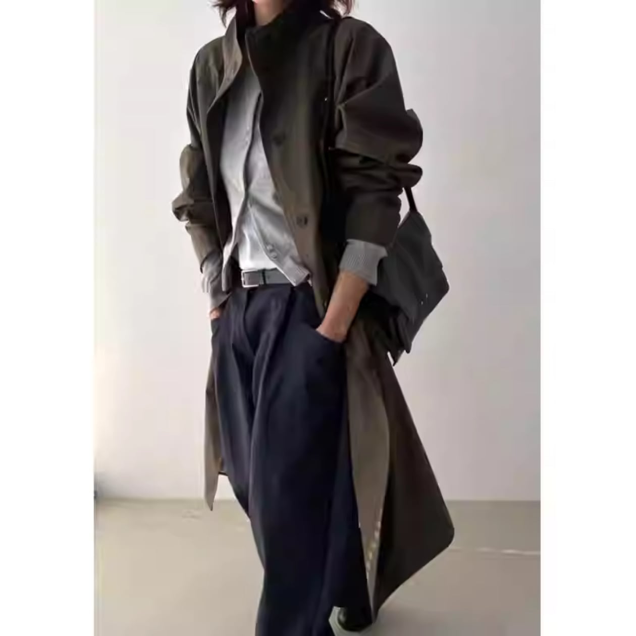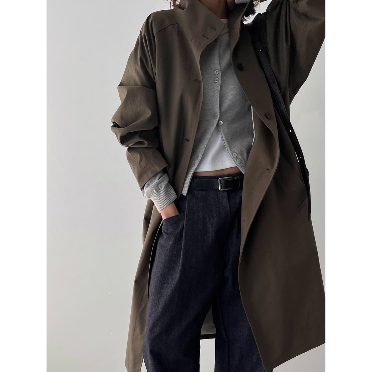 スタンドカラーのロング丈コートは、洗練された大人の着こなしに重宝します。