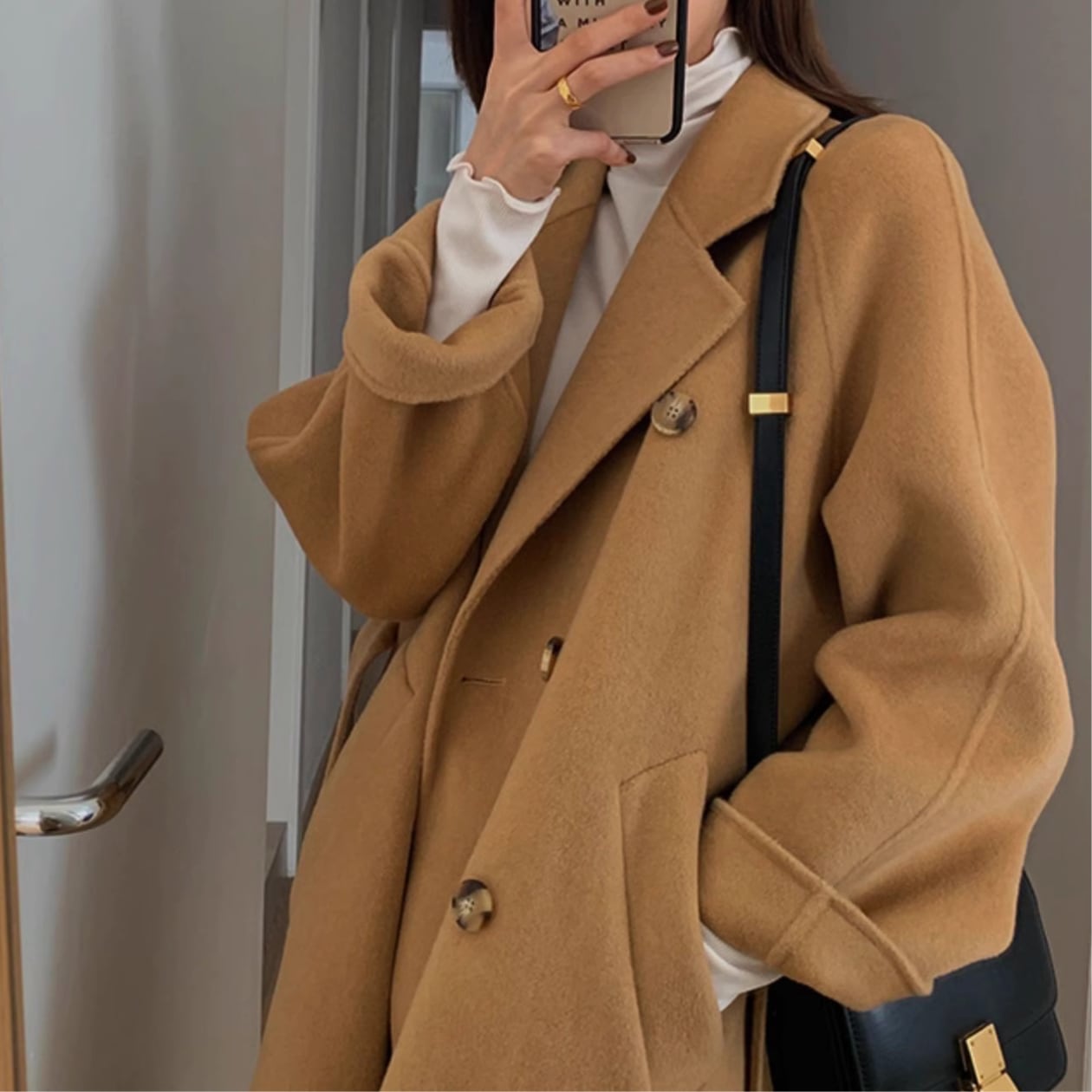 ダブルブレストのデザインが、クラシカルで上品な雰囲気を演出します。