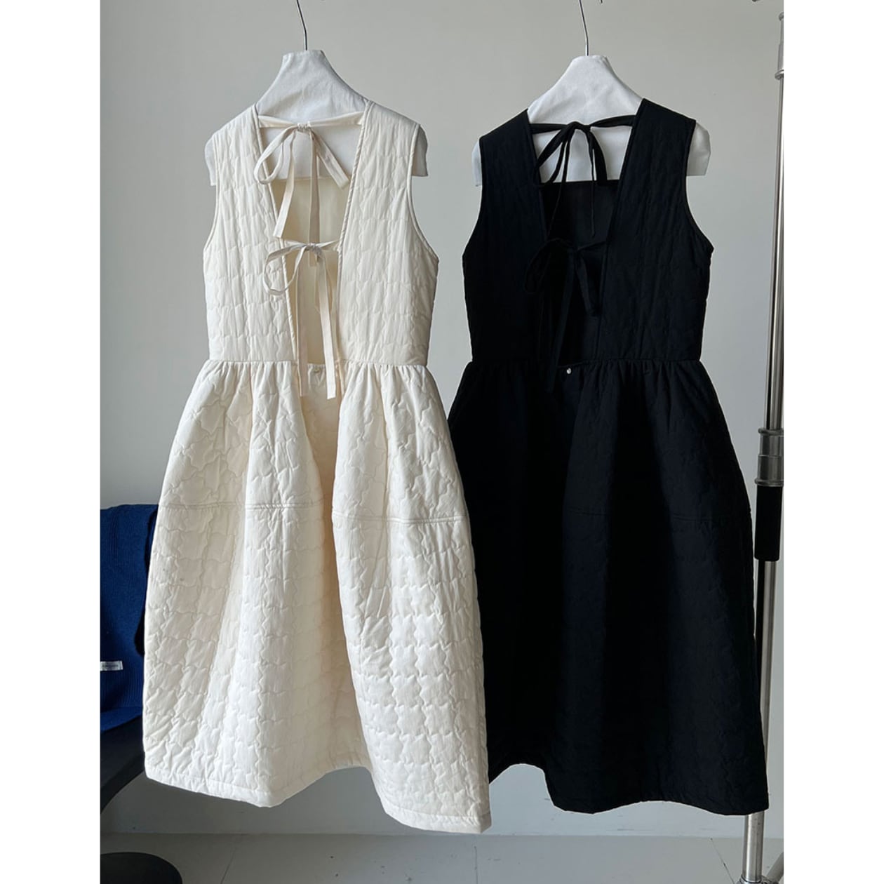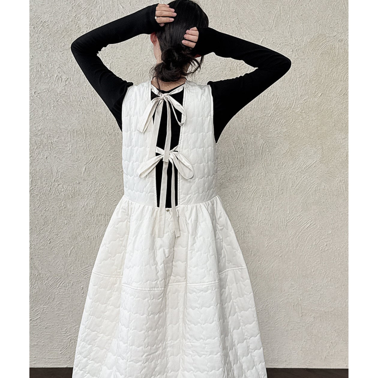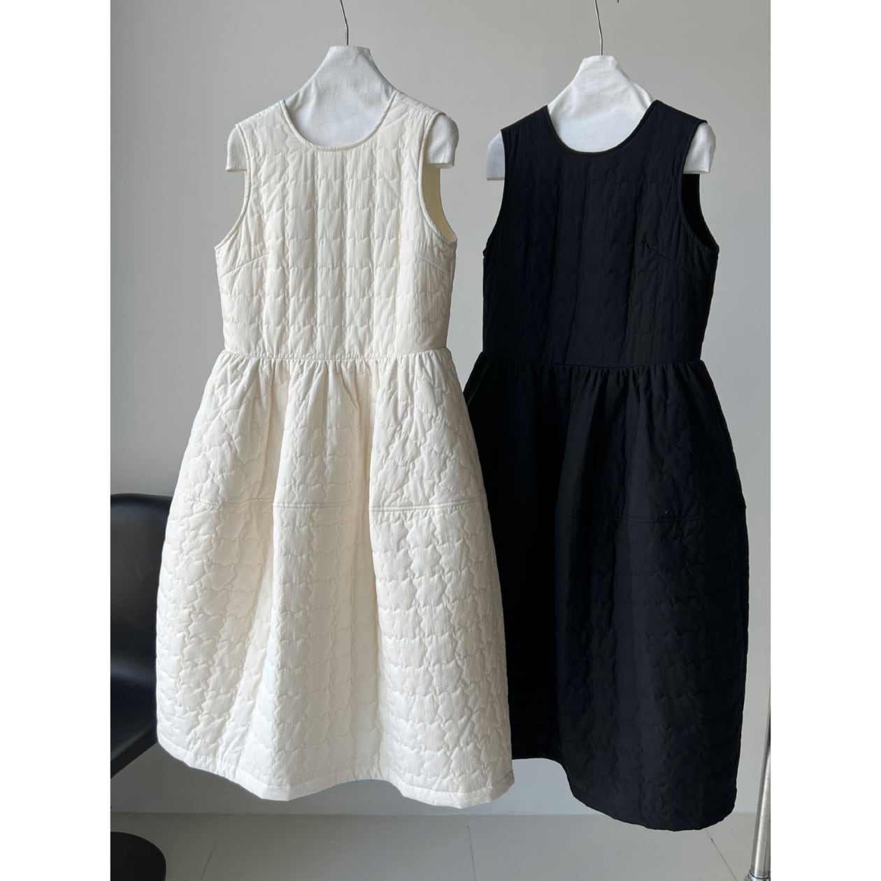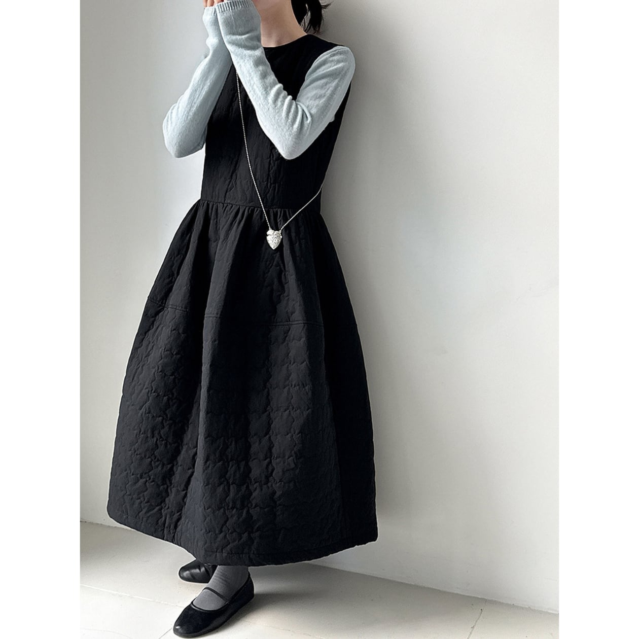 キルティングAラインワンピースは、カジュアルながらも上品な印象を与えます。
