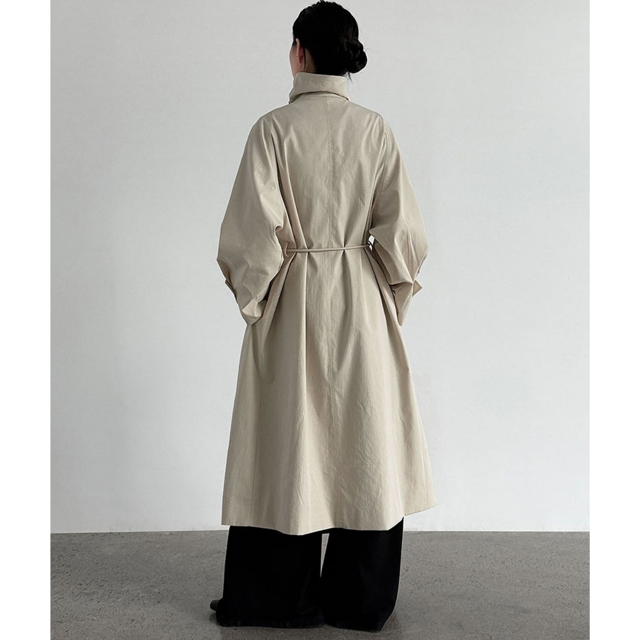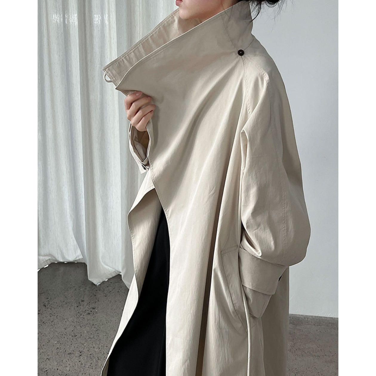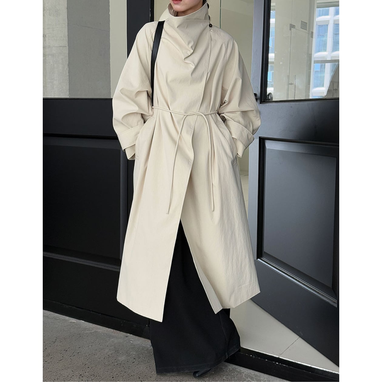 スタンドカラーが印象的なラップ風マキシ丈長袖コート。