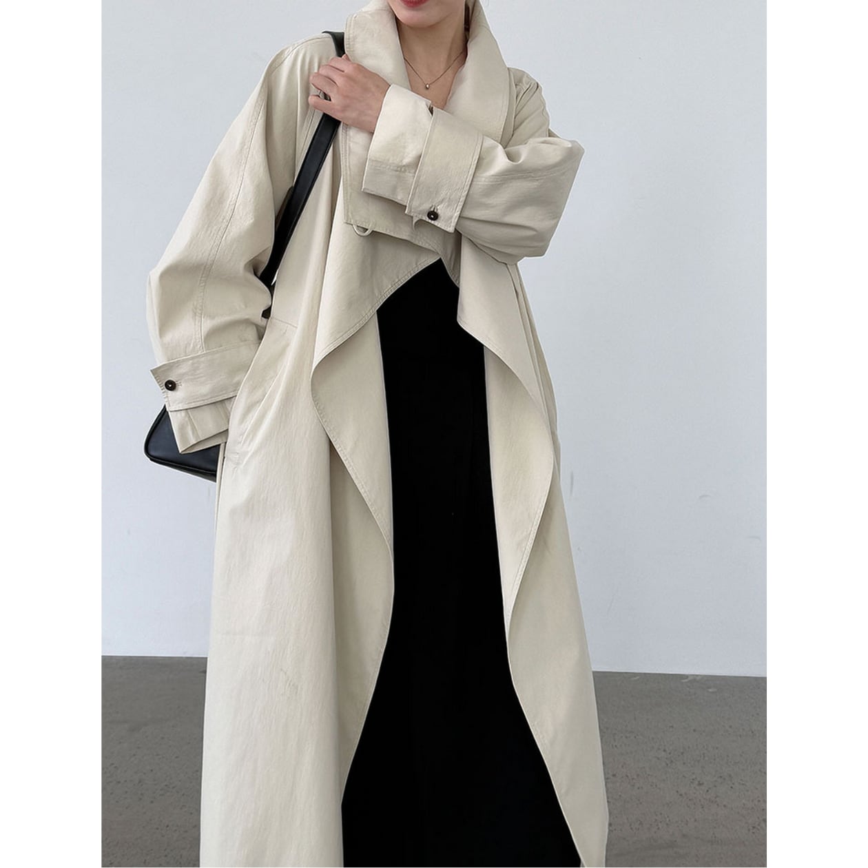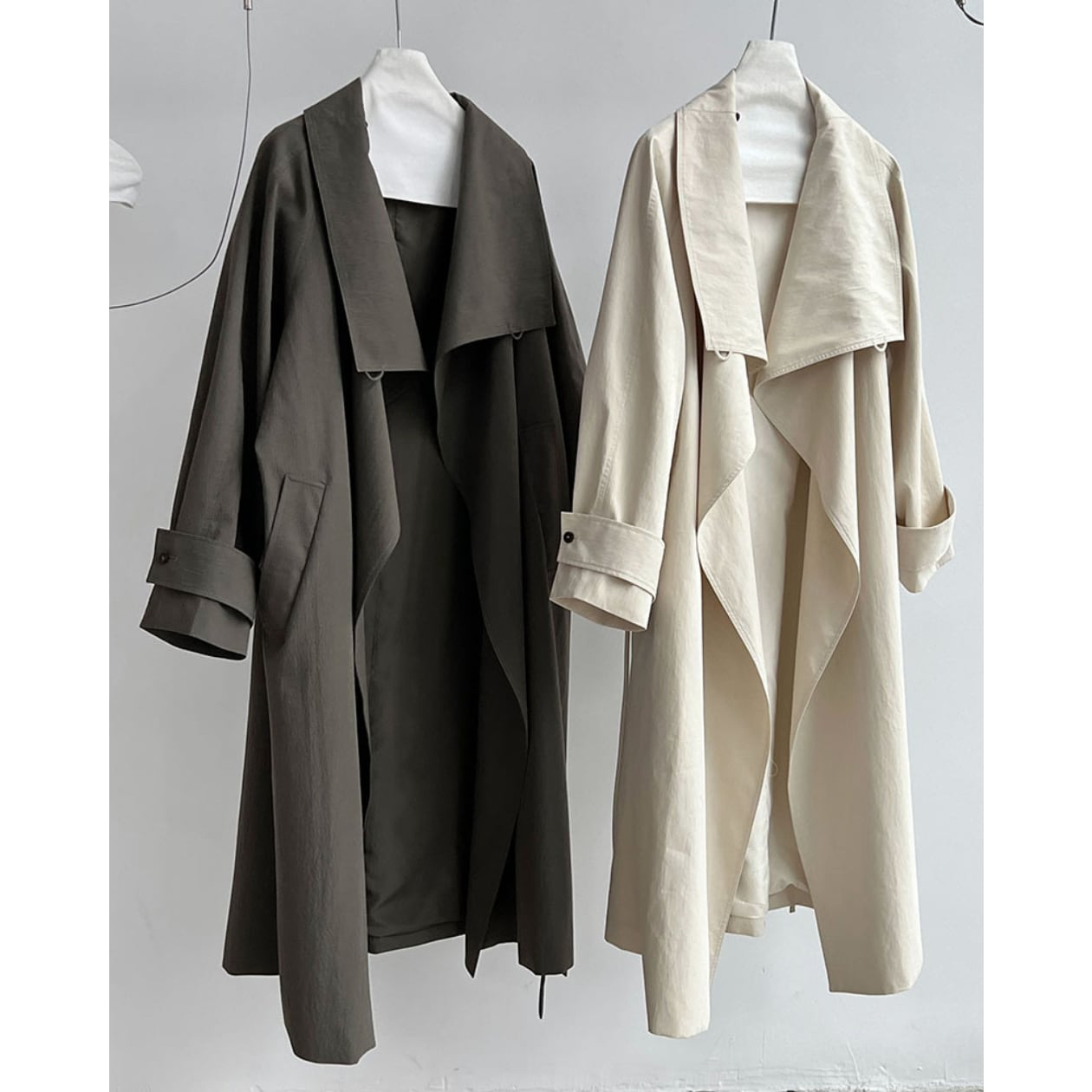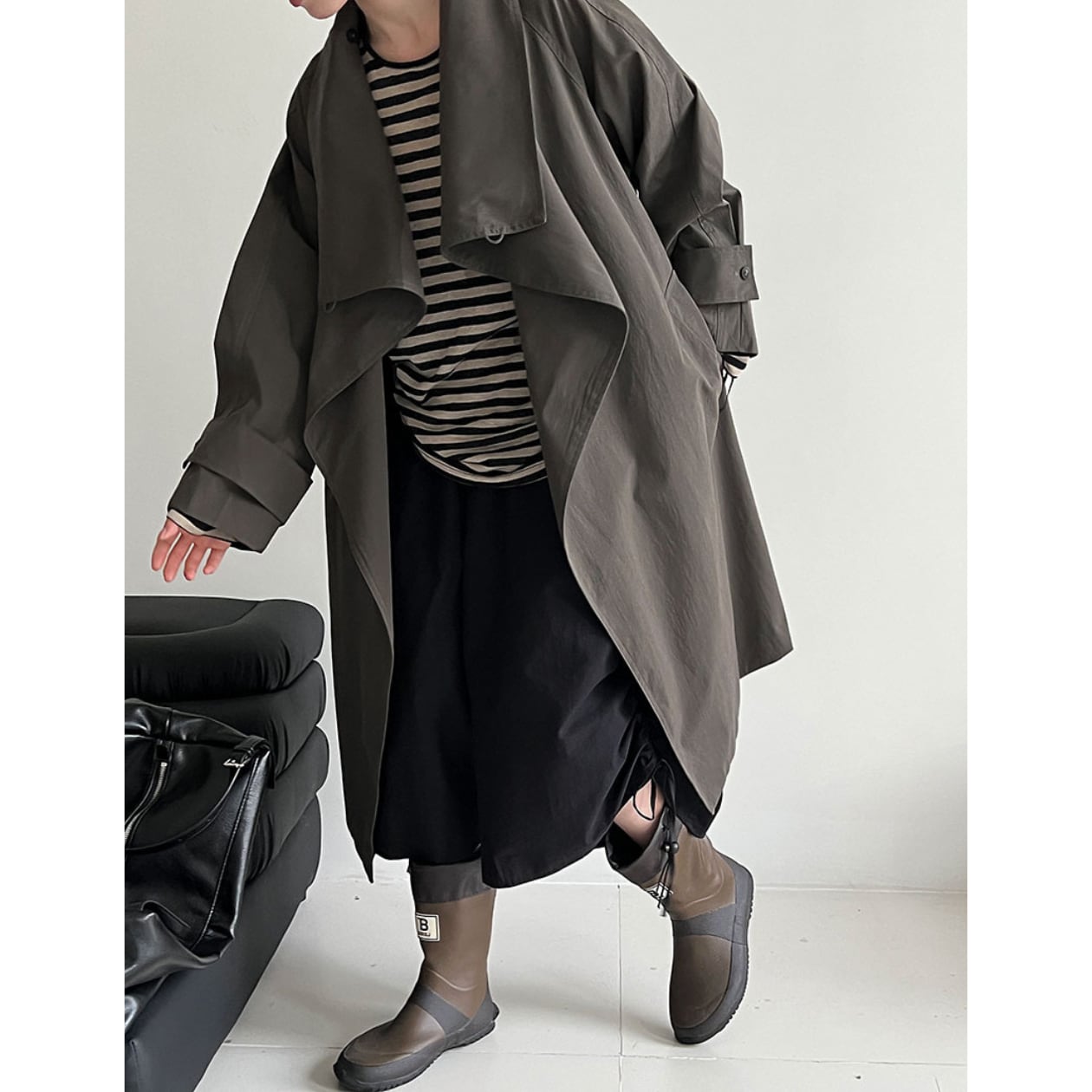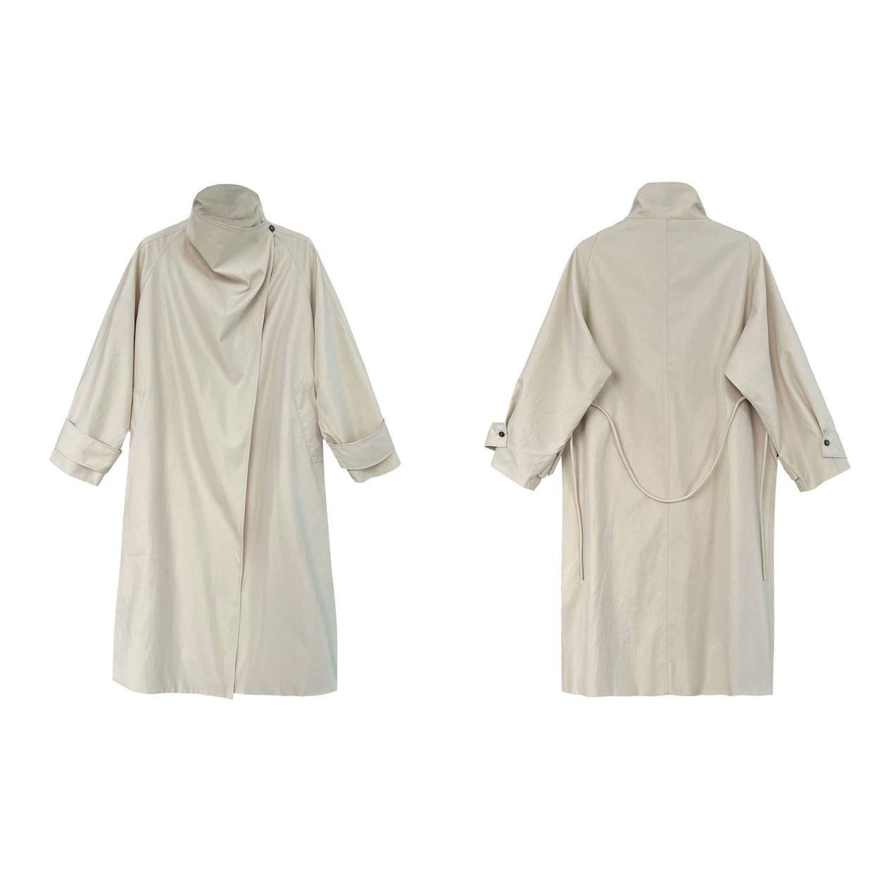 スタンドカラーが印象的なラップ風マキシ丈長袖コート。