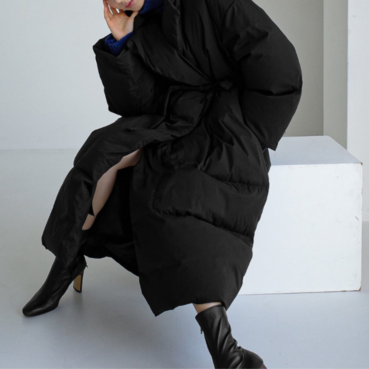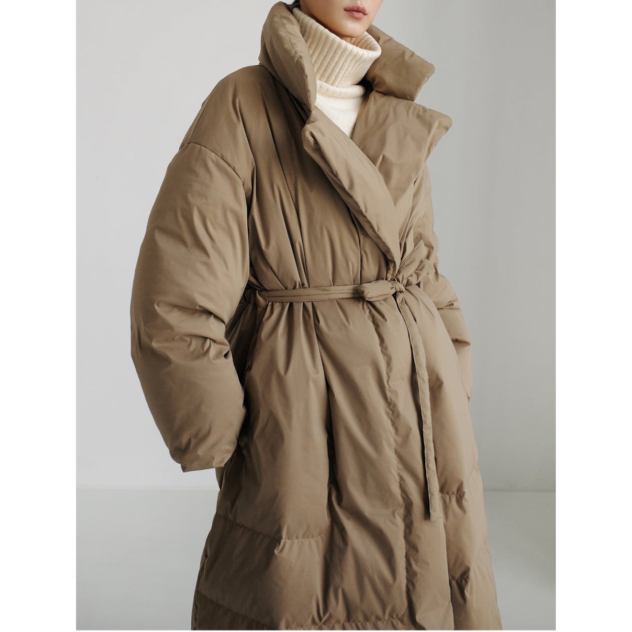 ラップ風デザインが大人っぽいロング丈ダウンジャケット。