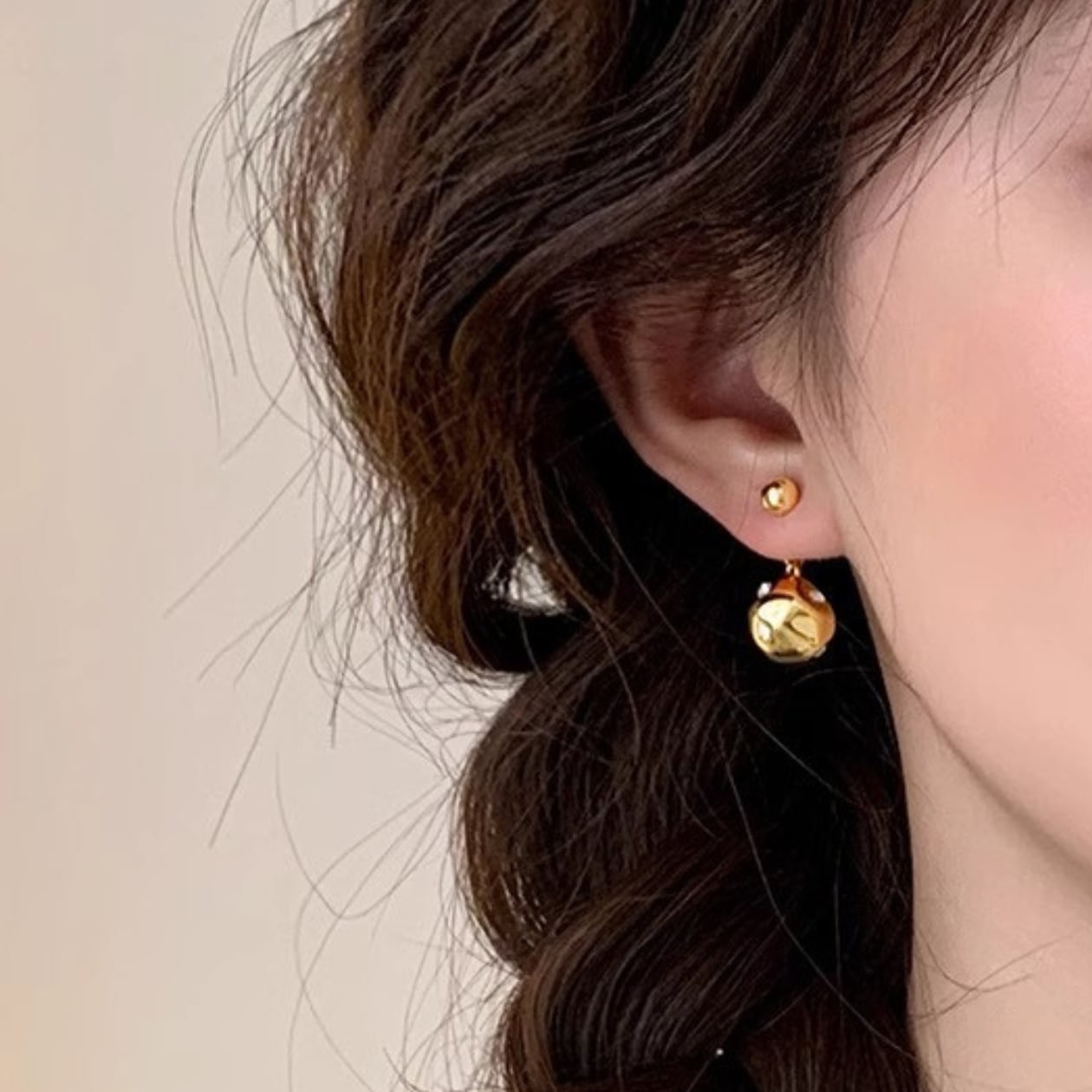 耳元で輝く、メタルデザインピアス。