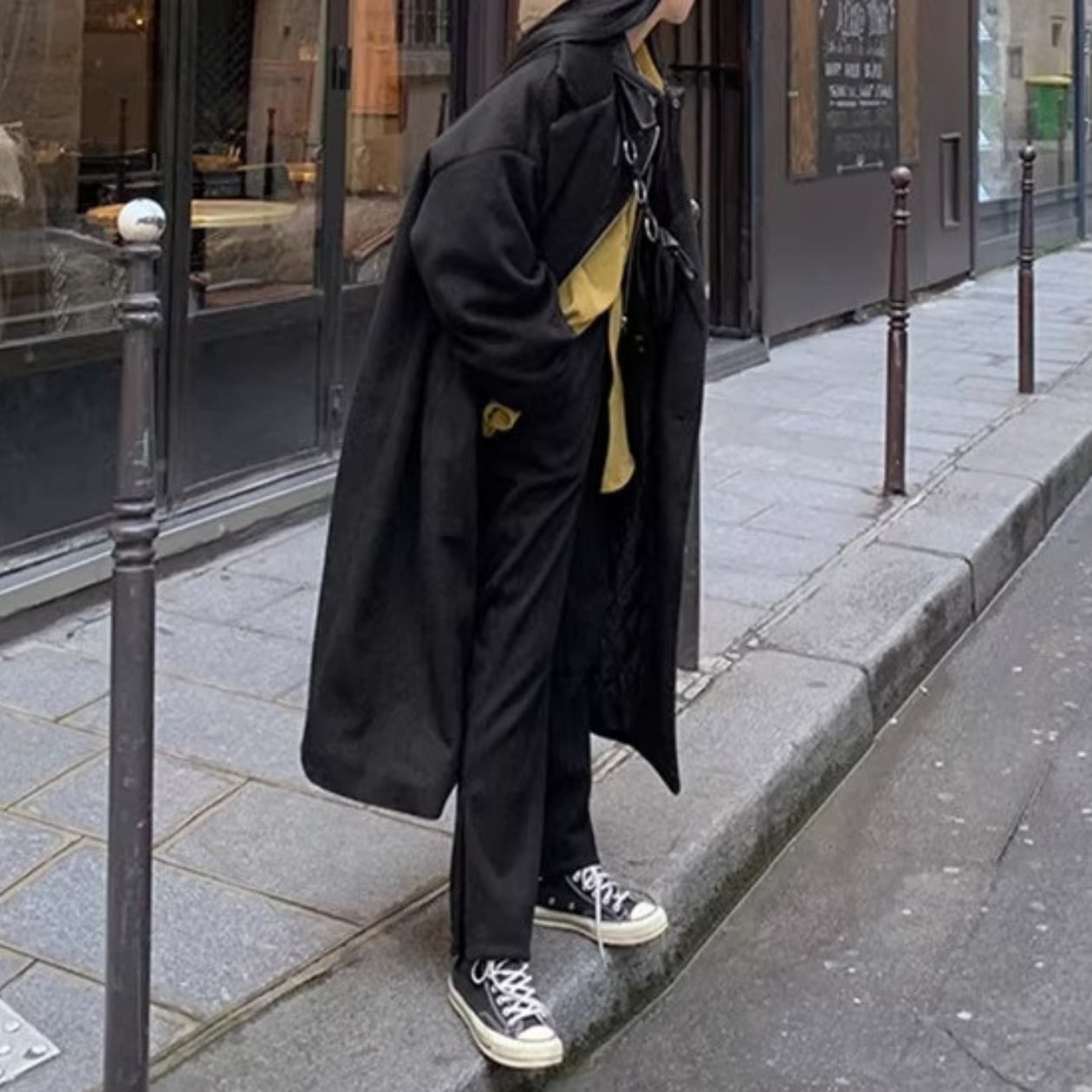 オーバーサイズのマキシ丈ジャケットは、羽織るだけでトレンド感のある着こなしが完成します。