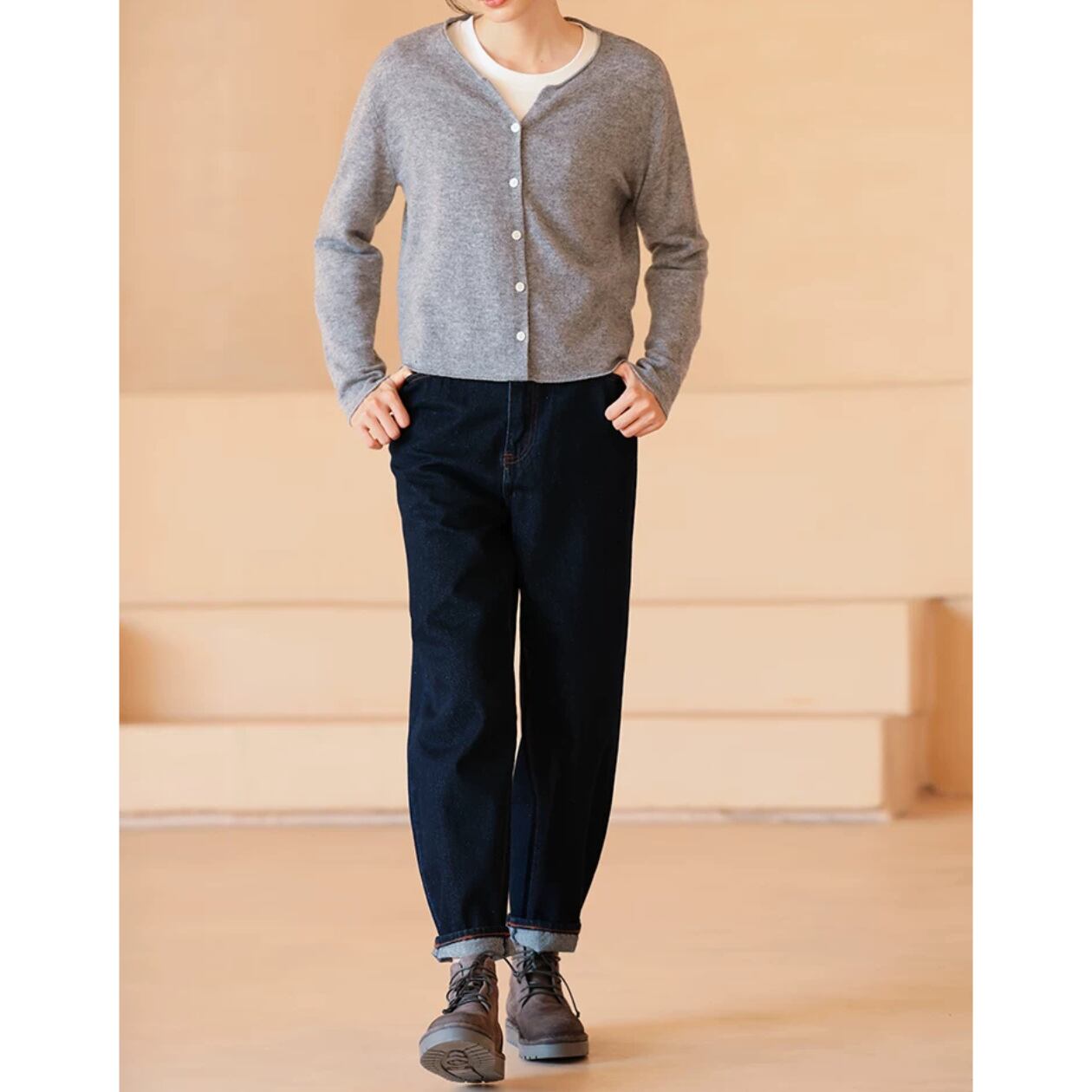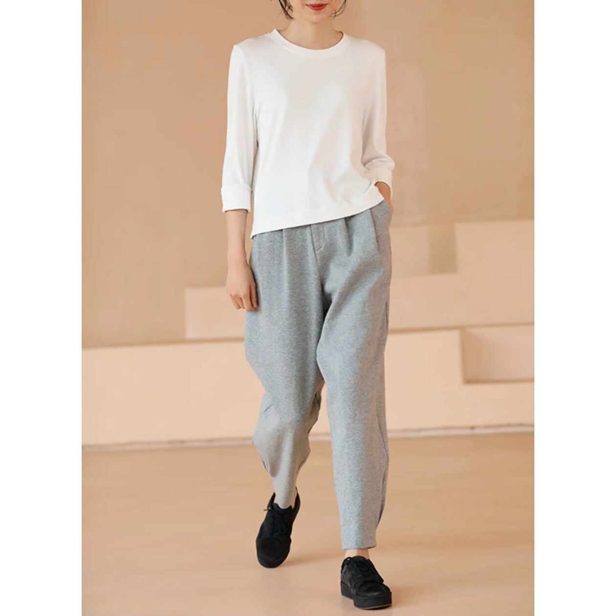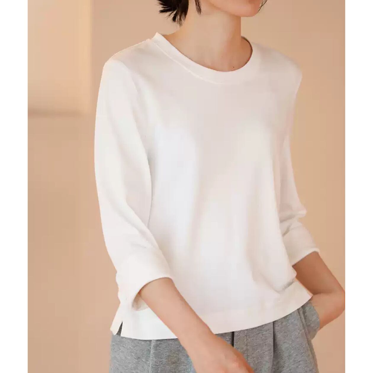 クルーネックとヒップ丈のシルエットは、どんなボトムスとも好相性。