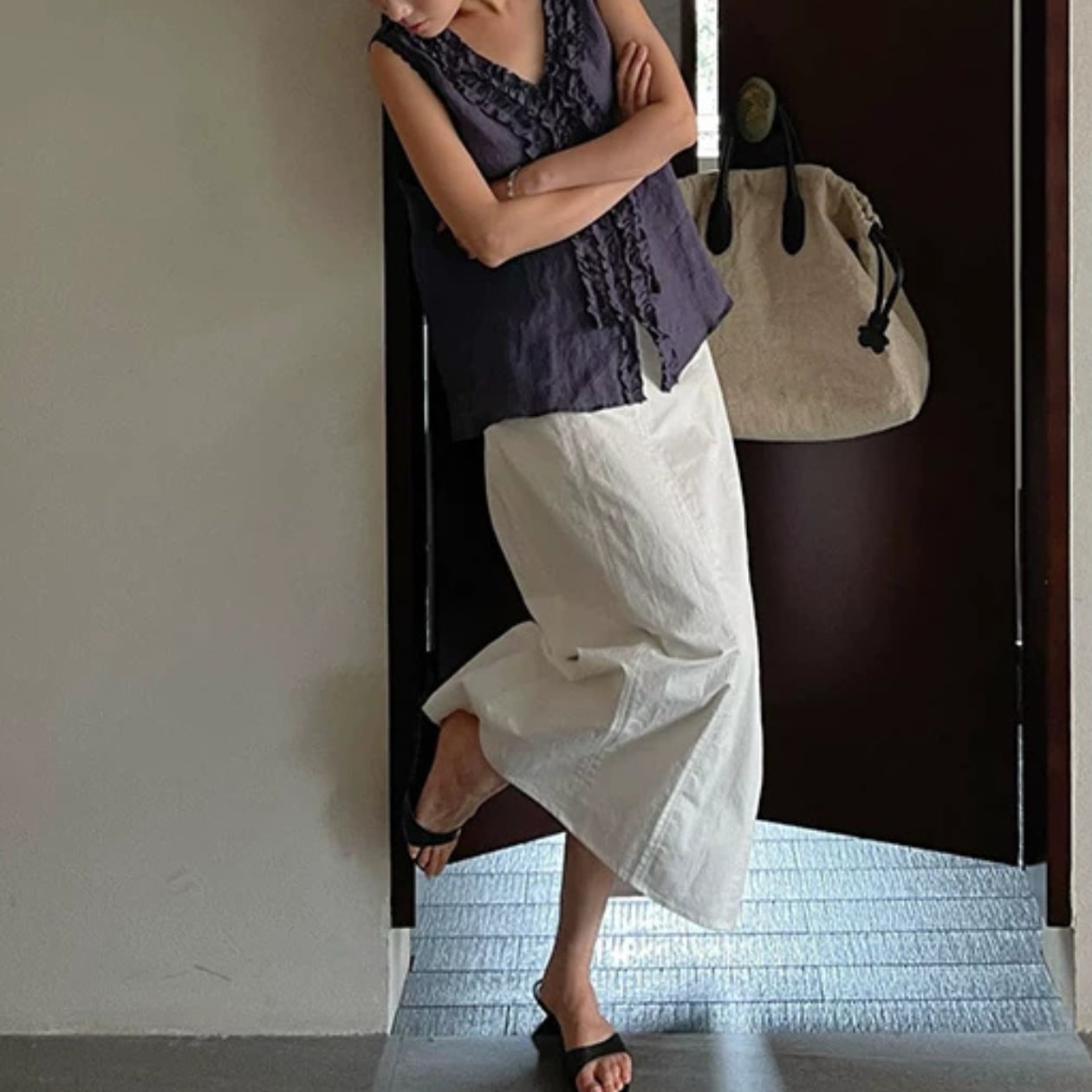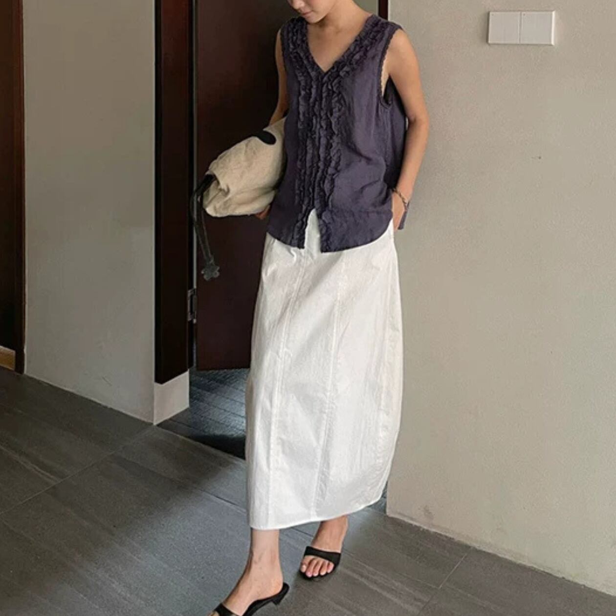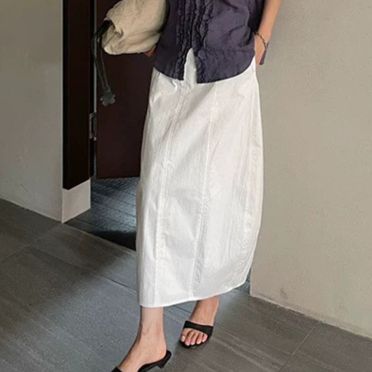 縦のラインが印象的なロング丈スカート。