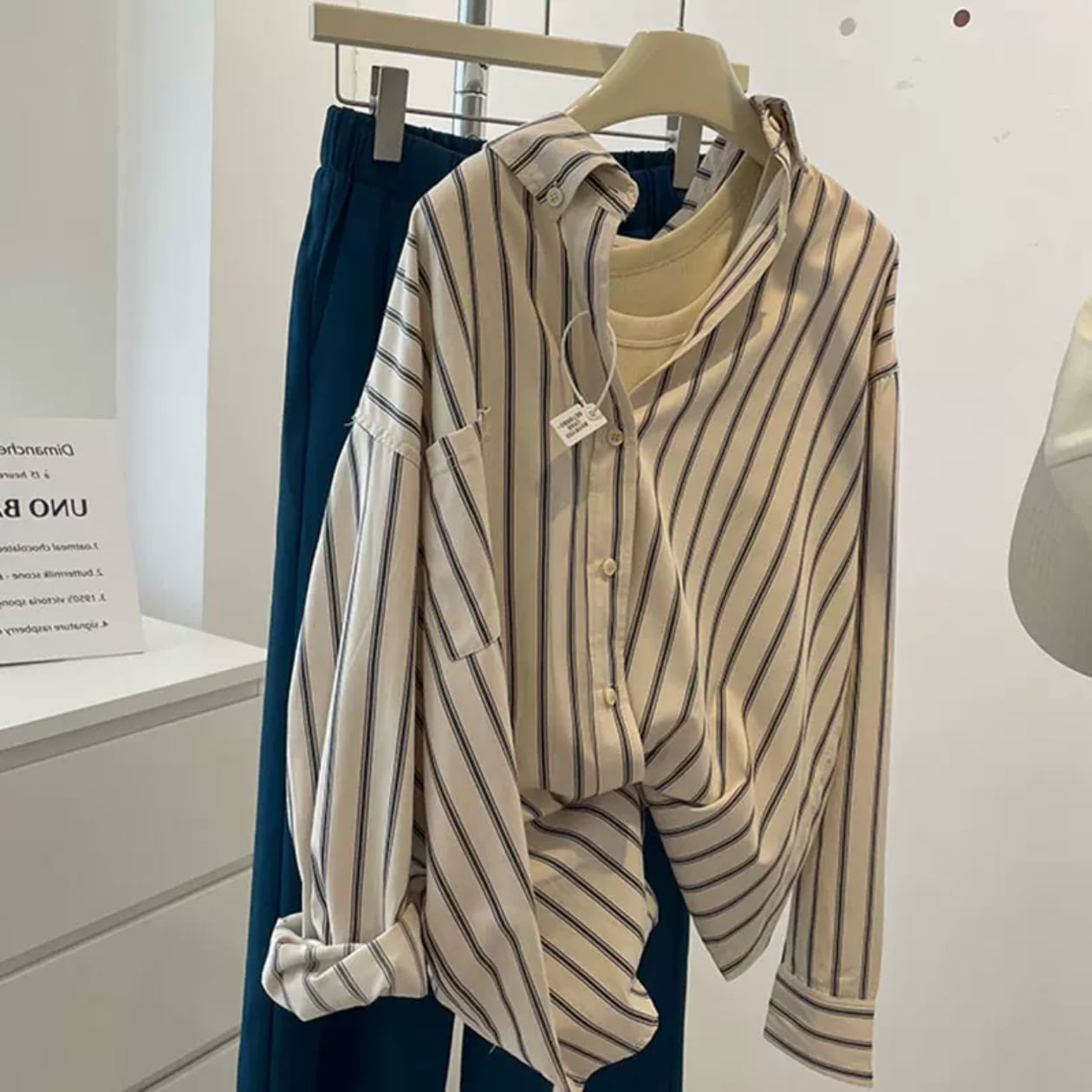 ストライプ柄ロング丈バンドカラーオーバーサイズシャツは、一枚で様になる着回し力抜群のアイテムです☆