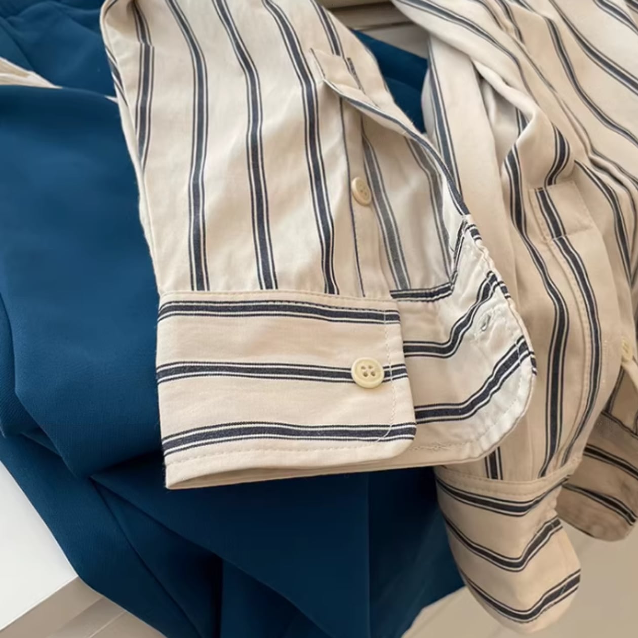 ゆったりとしたオーバーサイズシルエットと、落ち着いたストライプ柄が、こなれた雰囲気を演出。バンドカラーが上品さをプラスし、カジュアルすぎず、大人っぽい着こなしが叶います♪ 一枚で着てもサマになりますが、パンツスタイルにもスカートスタイルにも合わせやすく、様々なコーディネートを楽しめます!