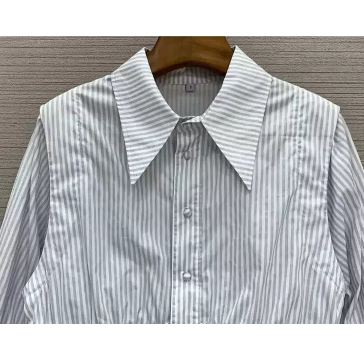 上品なストライプ柄と、女性らしいシルエットが魅力的。