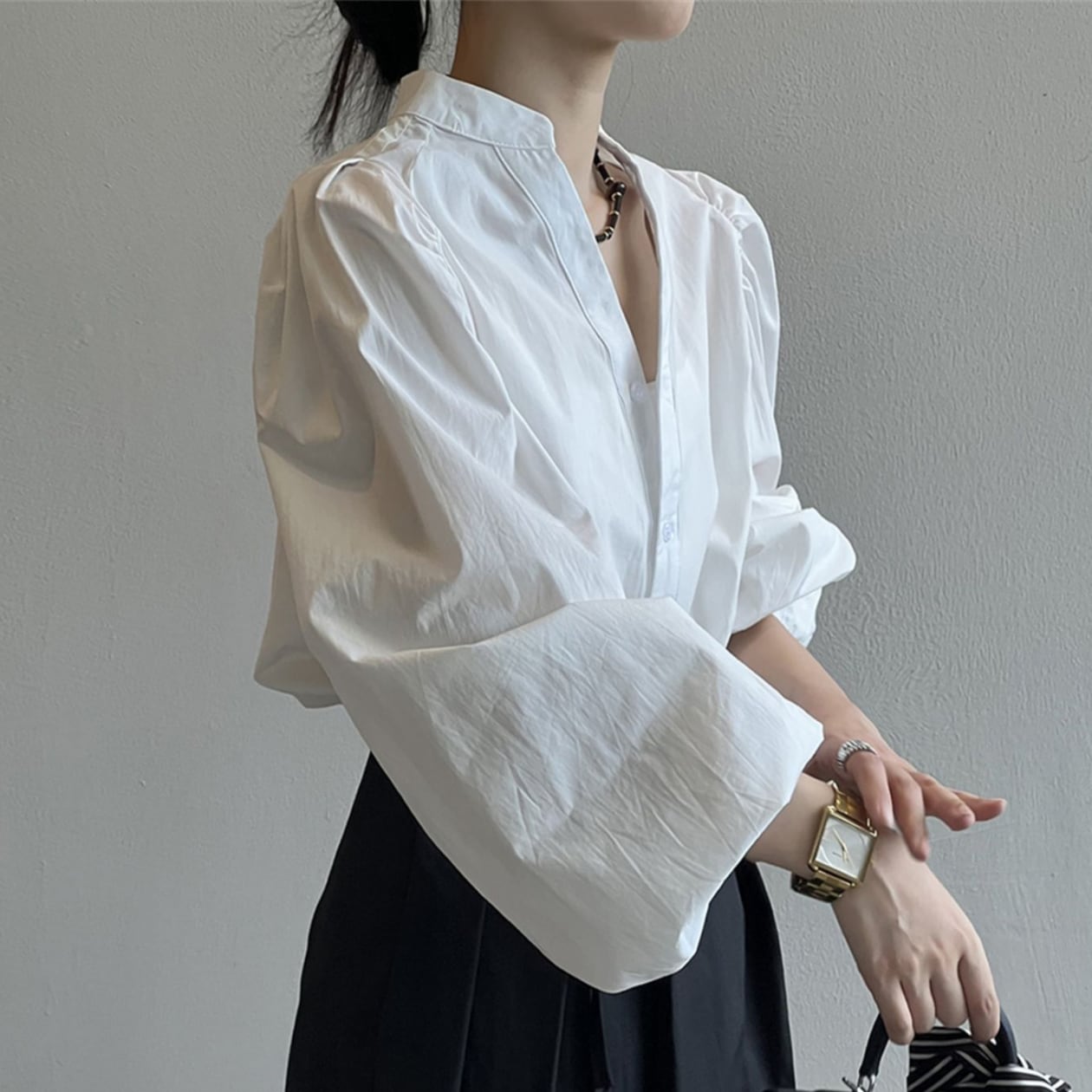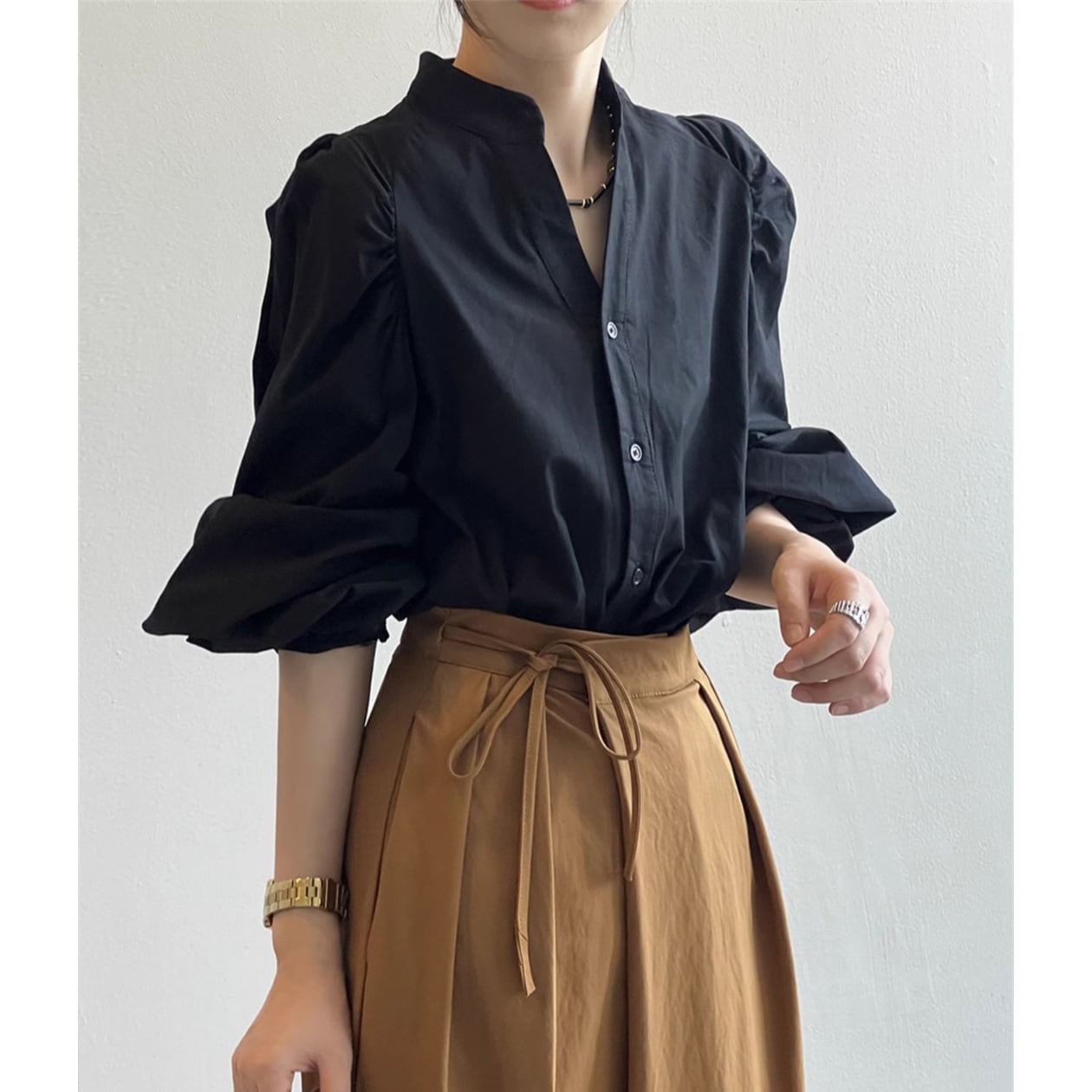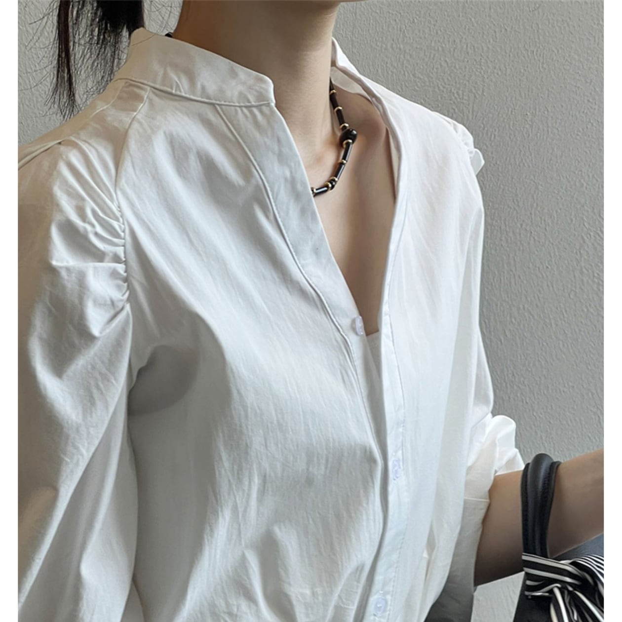 スタンドカラーとボタンダウンのデザインが、上品で洗練された印象を与えます。