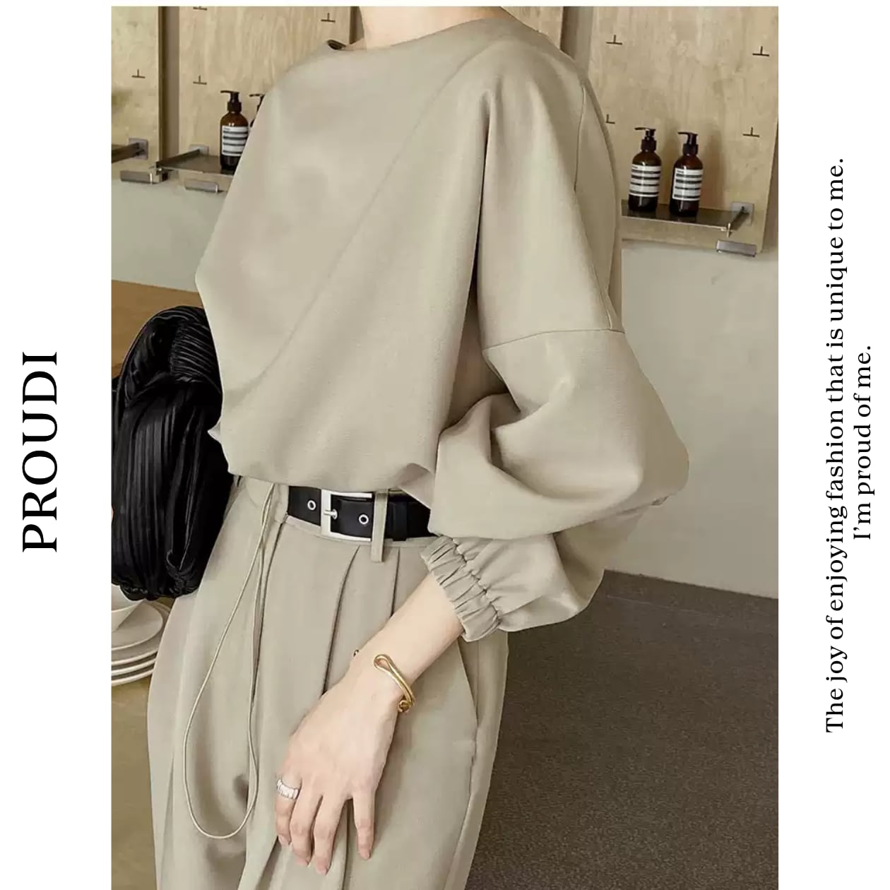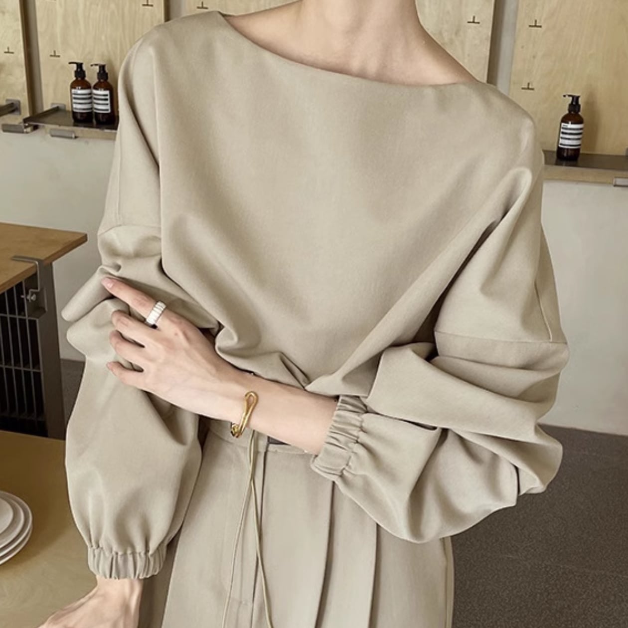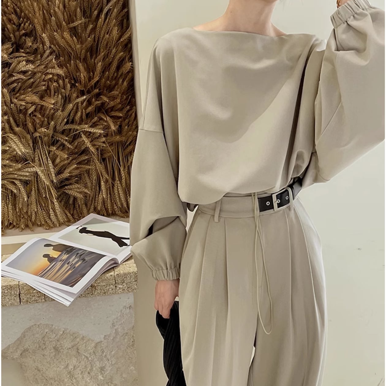 ボートネックとバルーンスリーブが女性らしいブラウスと、ハイウエストワイドパンツのセットアップです☆