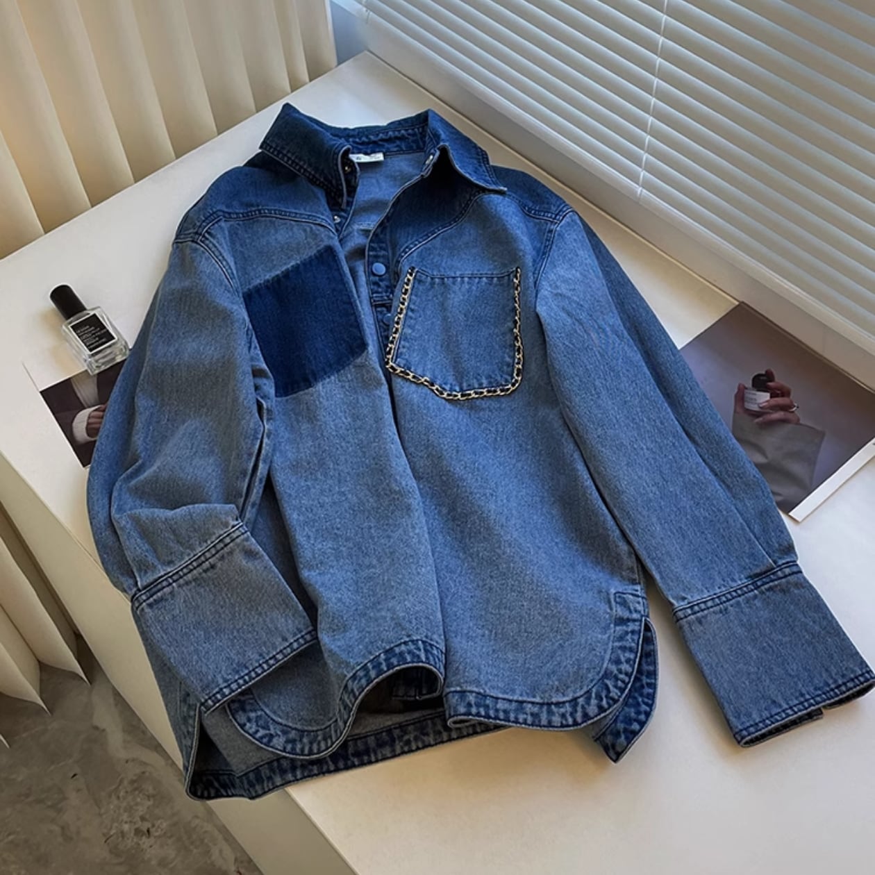 パッチワークデザインがアクセントになった、おしゃれなデニムシャツ。
