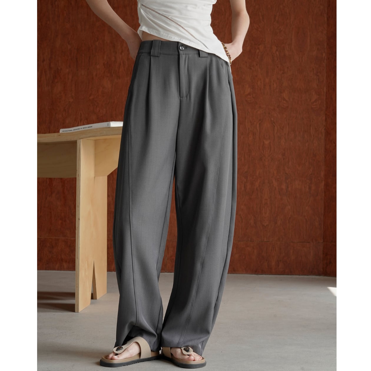 ハイウエストデザインが脚長効果を生み出し、ワイドレッグシルエットが体型カバーとリラックス感を両立。