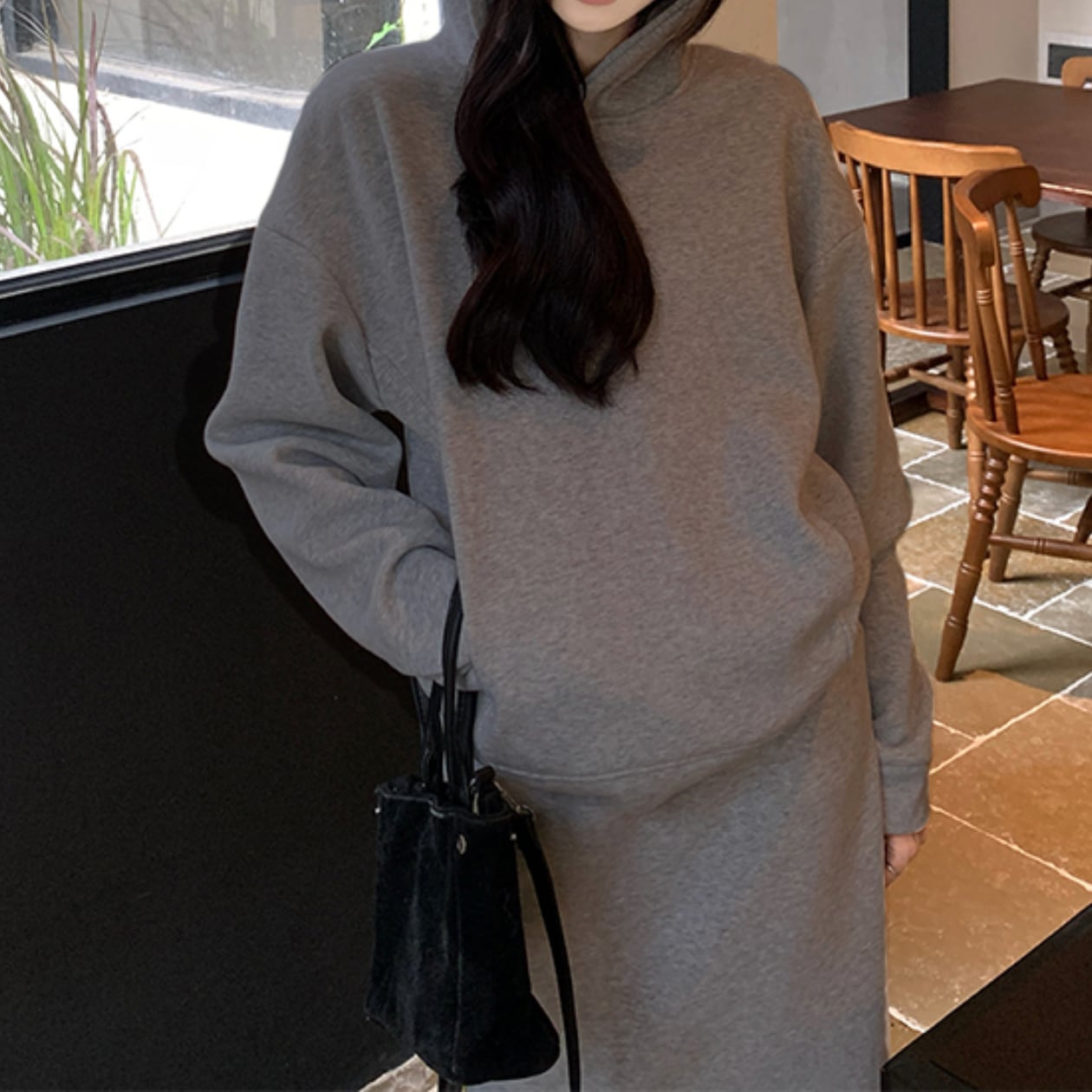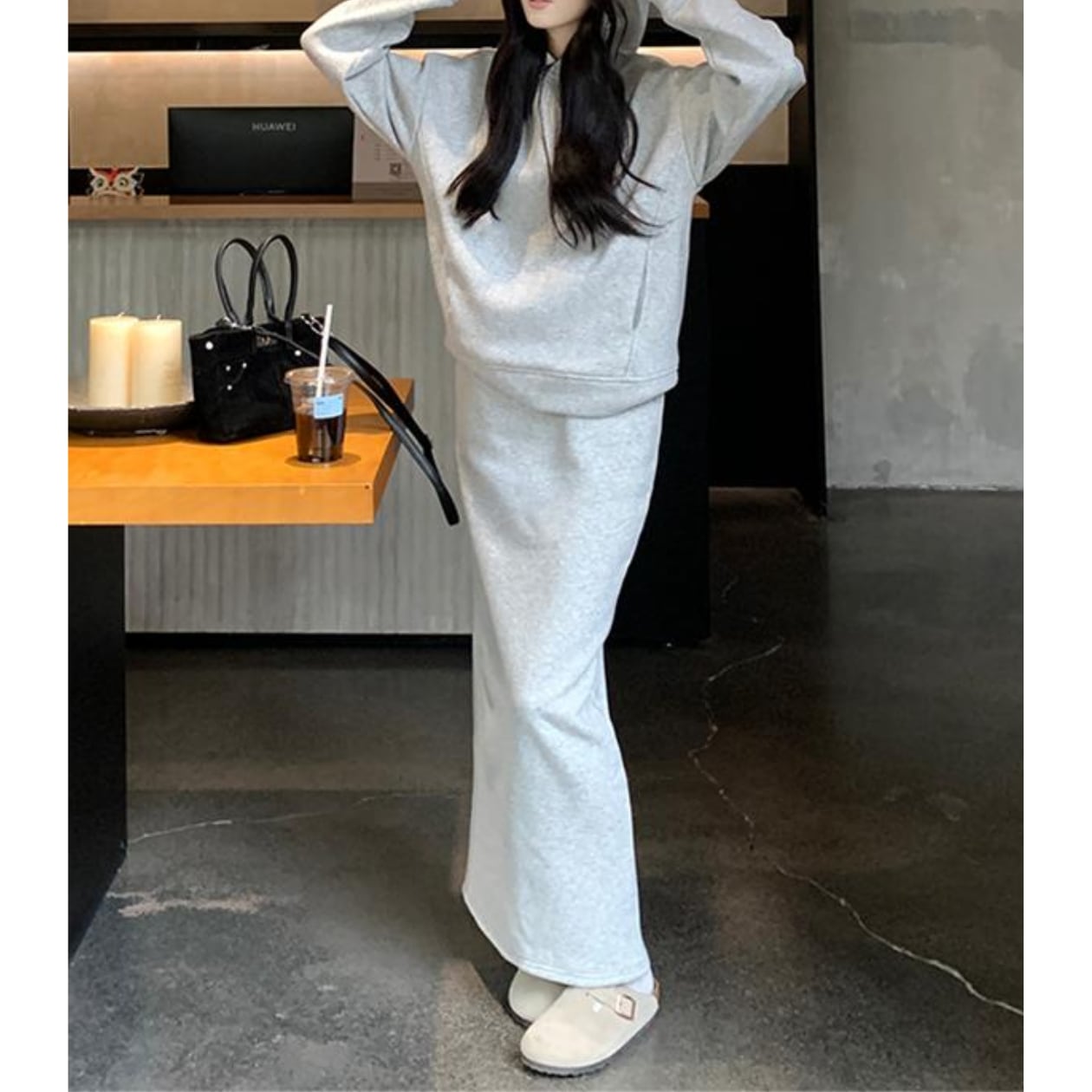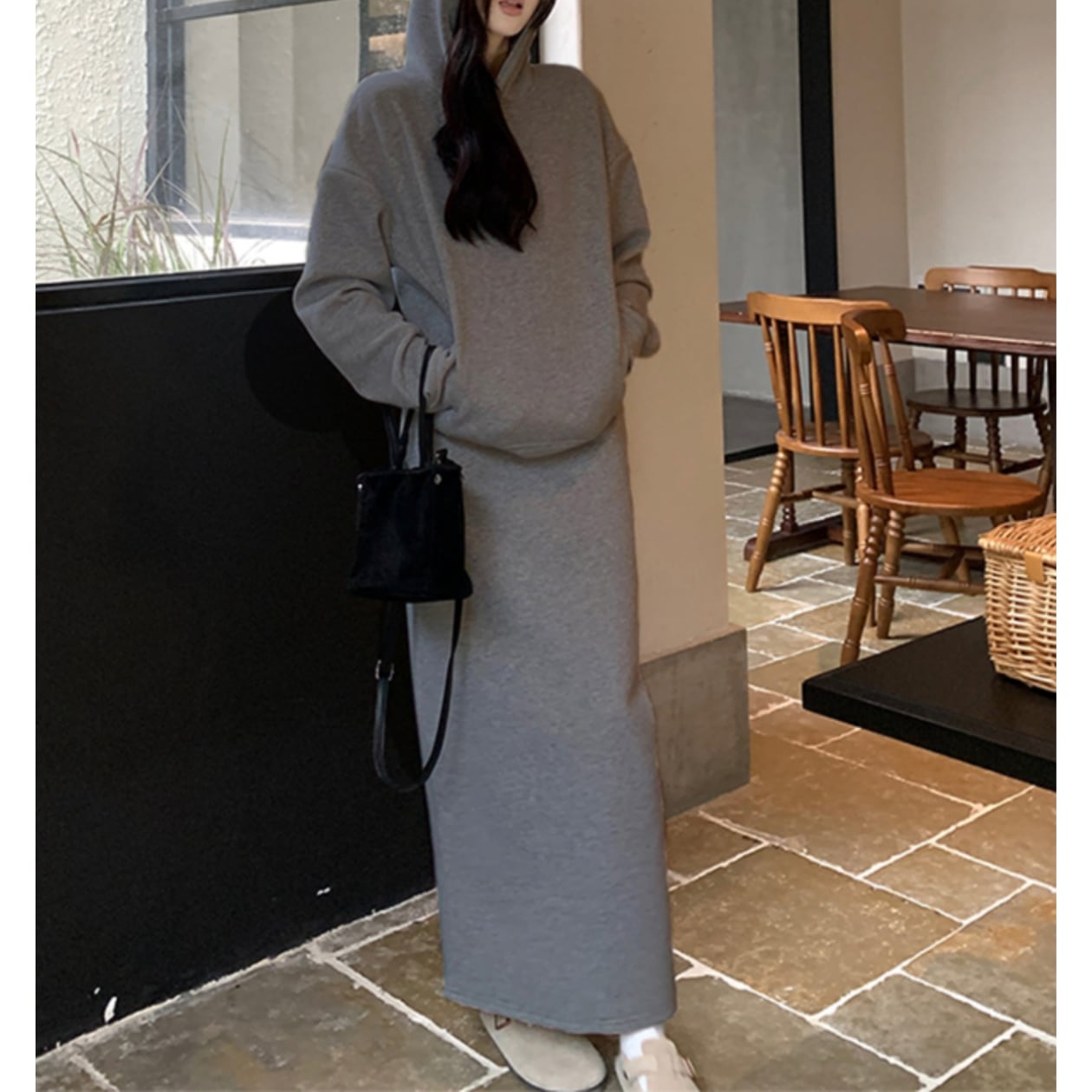 フード付きロング丈のセットアップパーカーは、一枚で着るだけでこなれた雰囲気を演出できる優秀アイテムです☆