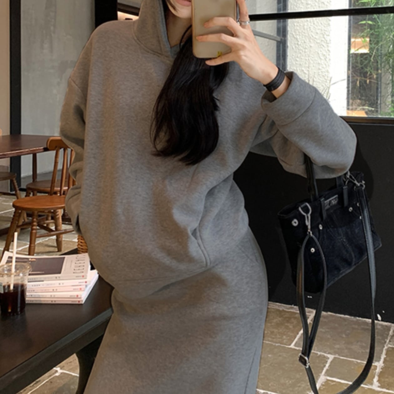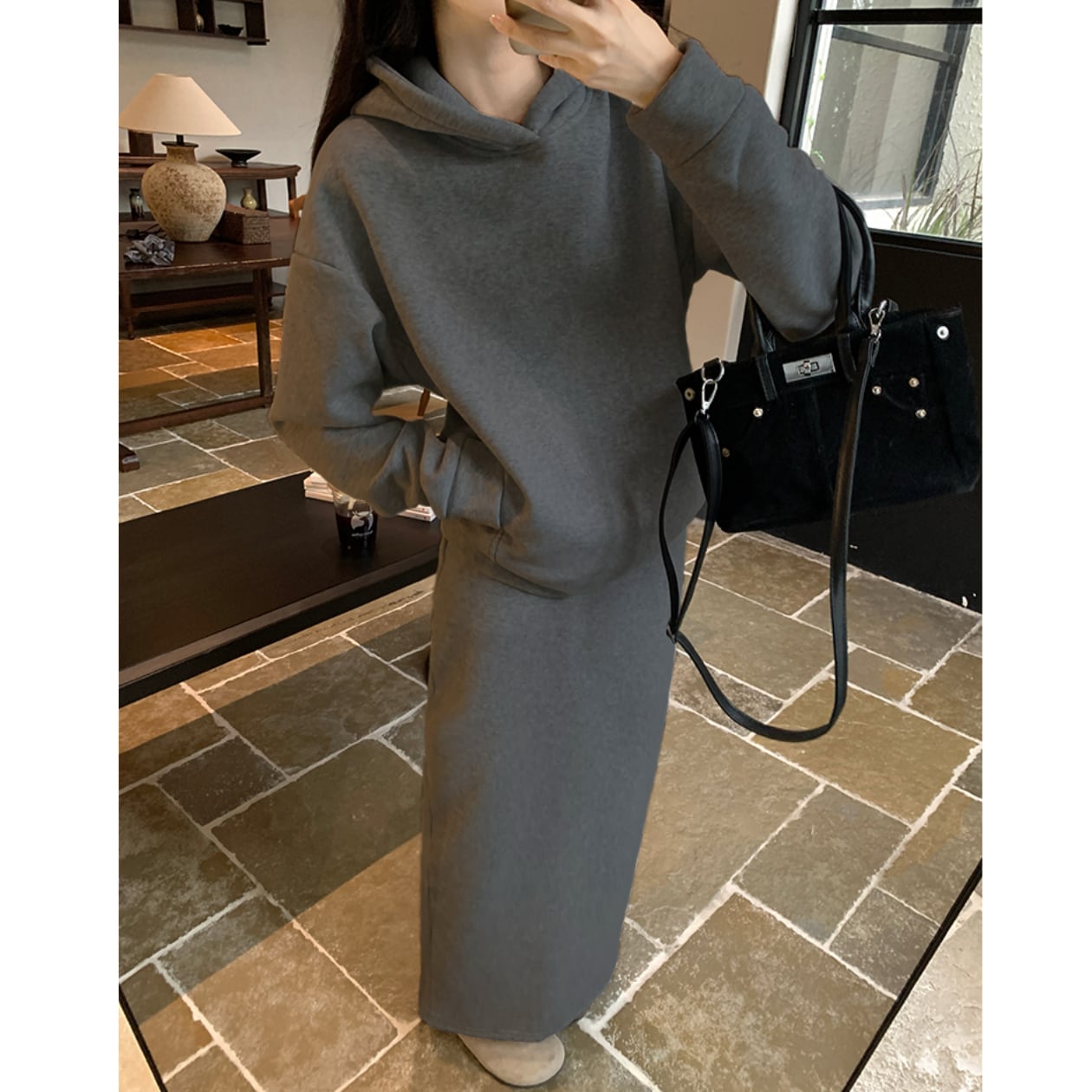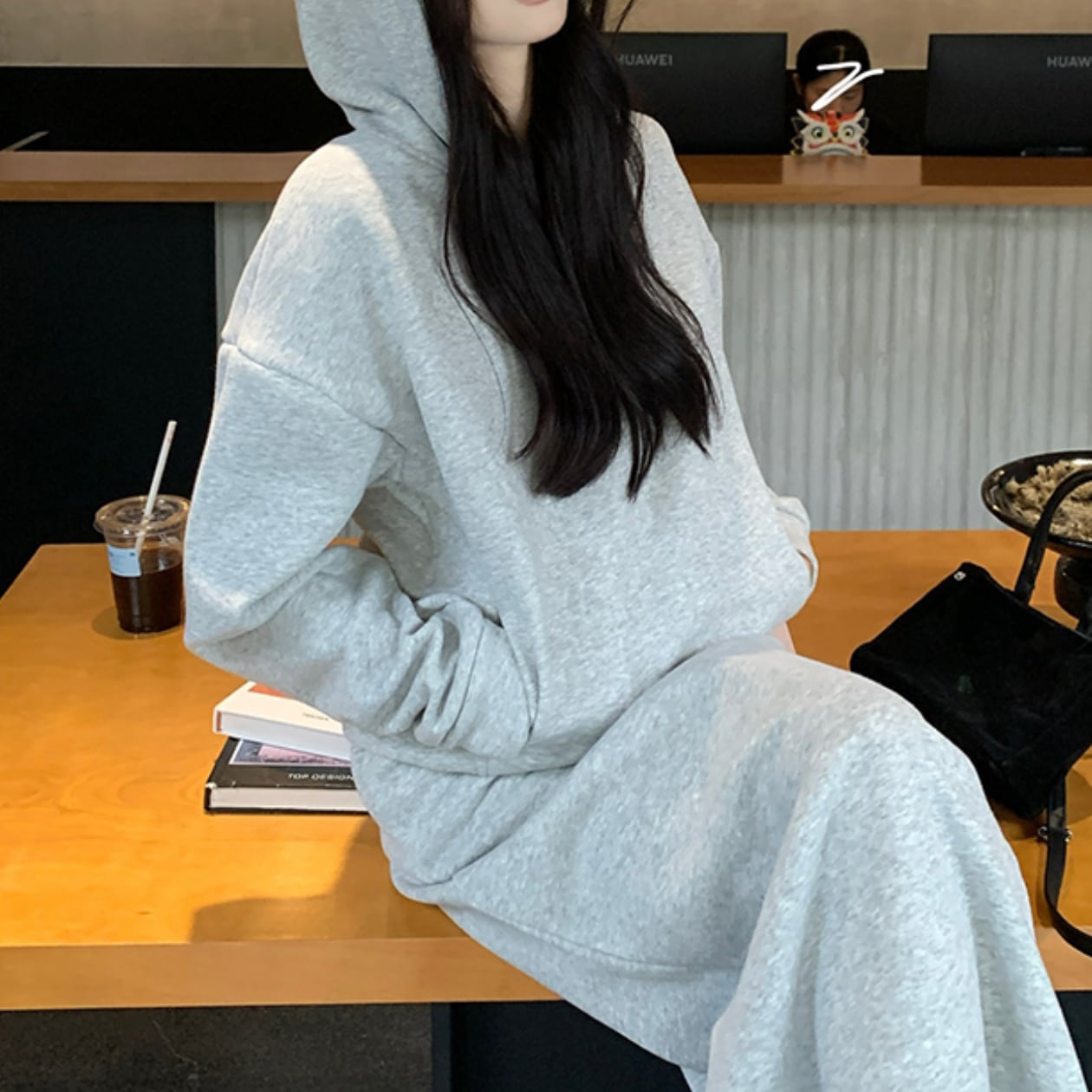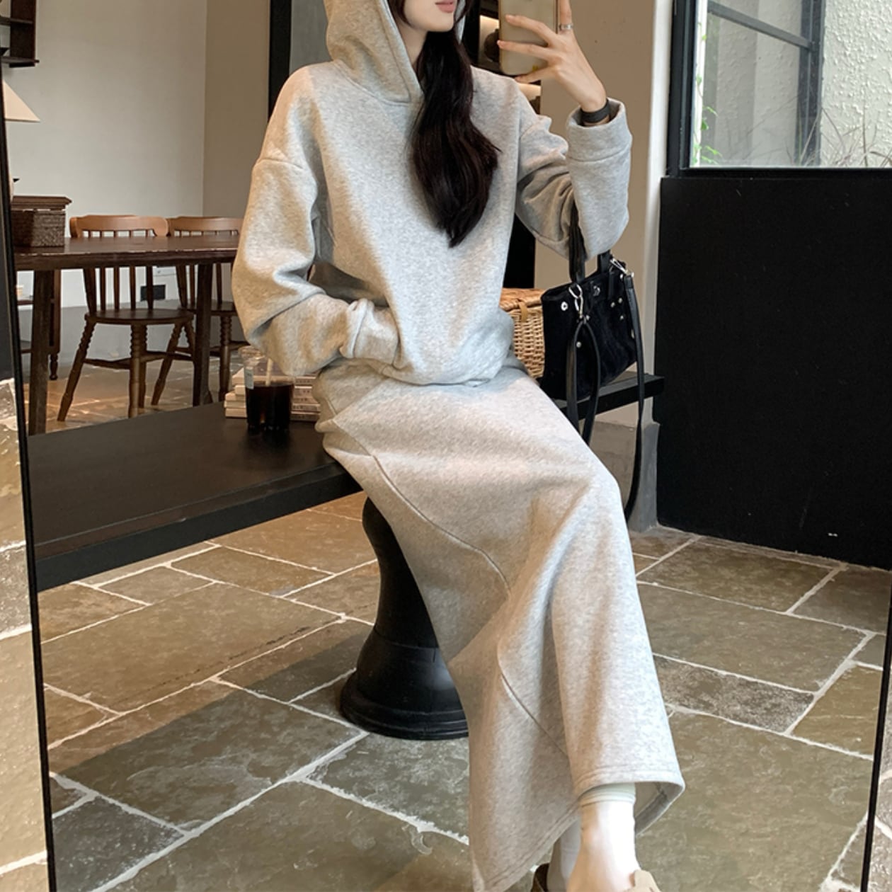 フード付きロング丈のセットアップパーカーは、一枚で着るだけでこなれた雰囲気を演出できる優秀アイテムです☆